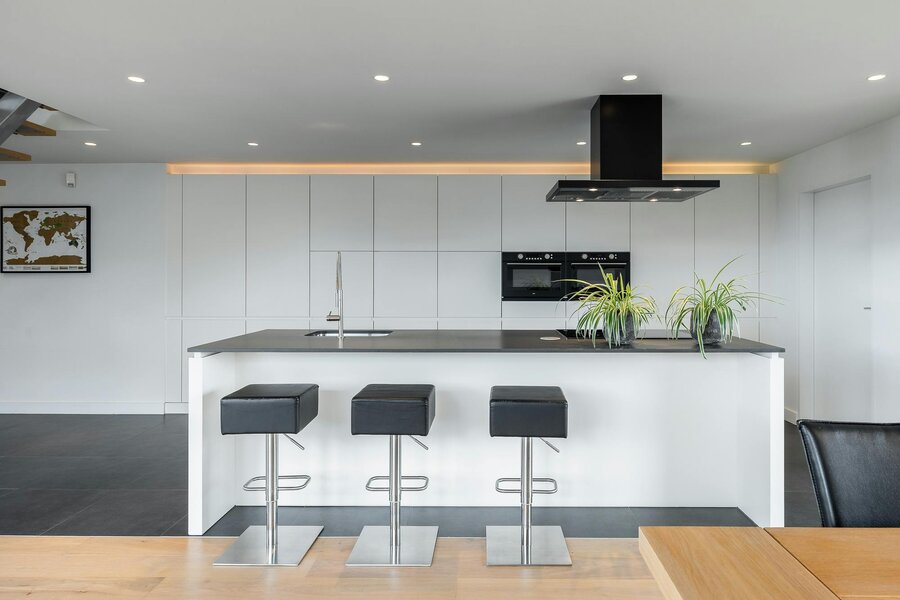 The timeless kitchen is a fine example of customization with a fully enclosed wall and a large island that is beautifully integrated into the living room.