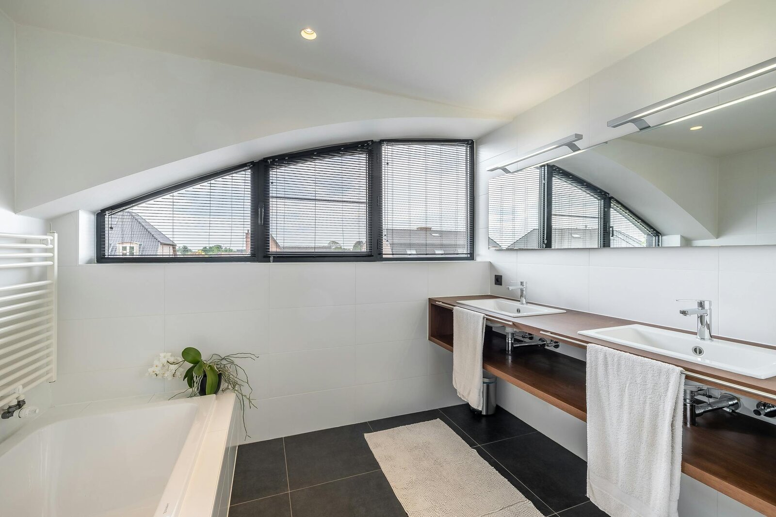 Upstairs you will also find 3 bedrooms, a 2nd bathroom with double washbasin and walk-in shower, separate toilet and extremely practical laundry/storage space.