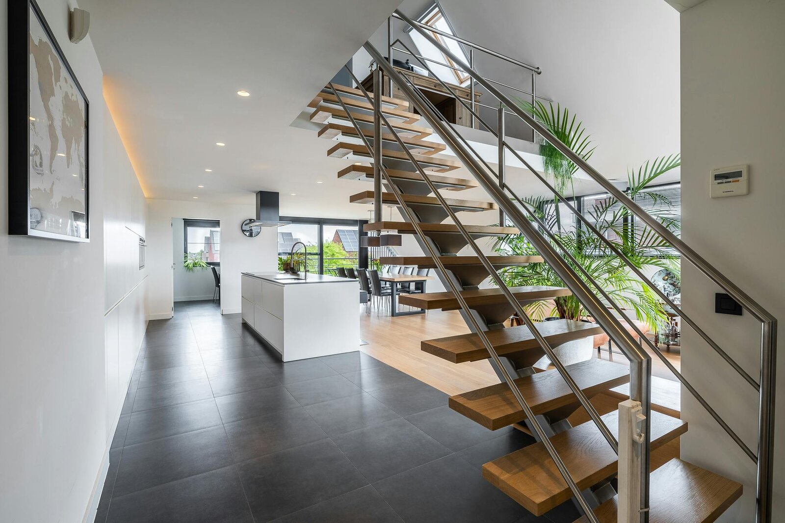 The modern open staircase to the top floor was architecturally beautifully woven into the whole. Very professionally and aesthetically, various things were nicely aligned.