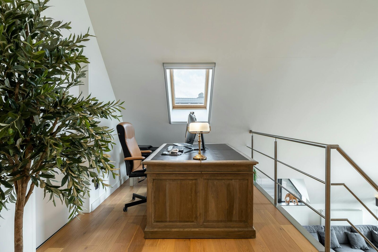 From the mezzanine (office space), you have a wide view to the west through the triangular windows.
