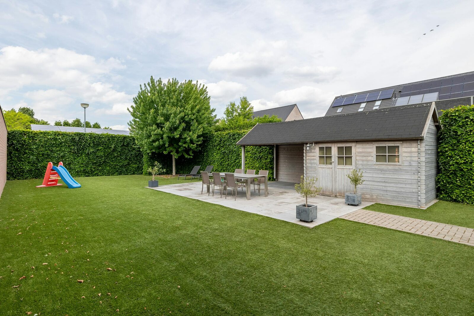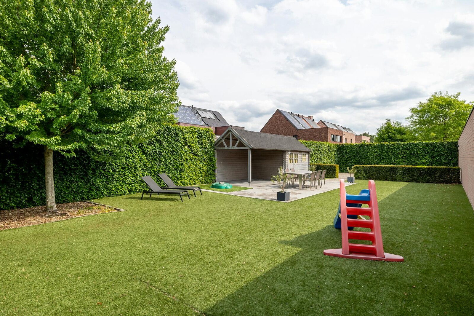 - maintenance-friendly large garden, high privacy, equipped with artificial grass and garden house with covered terrace, electricity for lighting and refrigerator