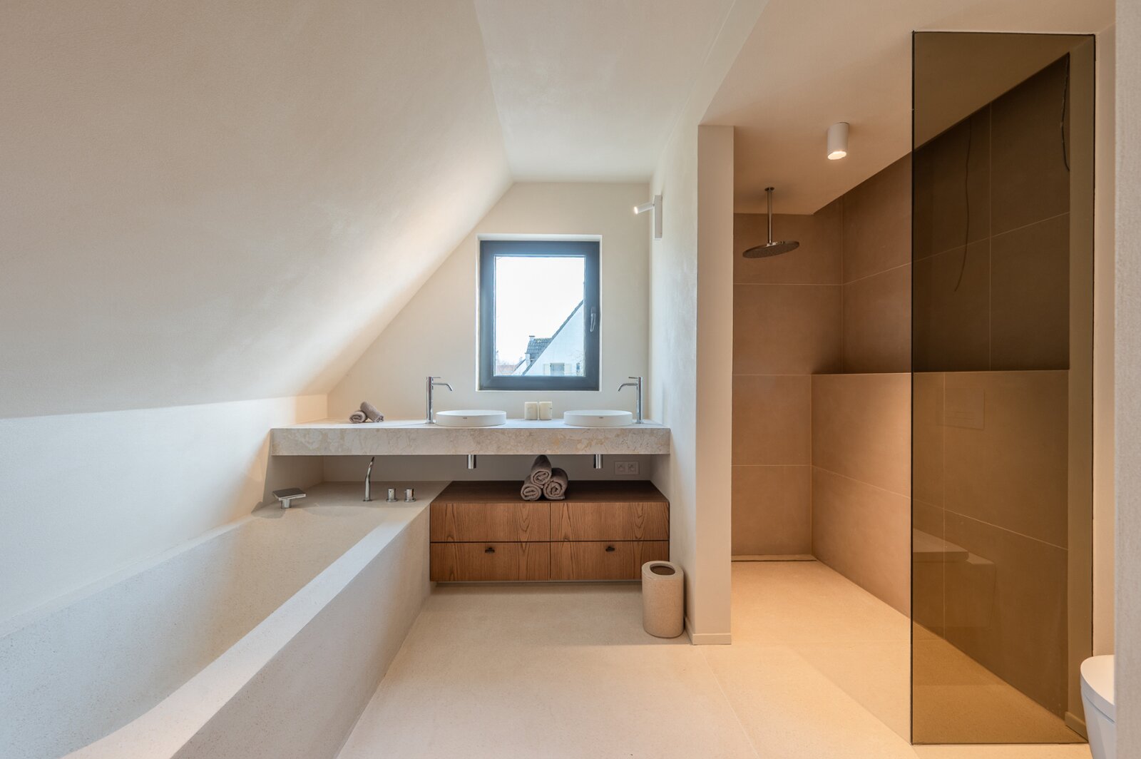 Upon entering you enter a stylish entrance hall with guest toilet. The bright living space with cozy gas fireplace and large windows offers a beautiful view of the garden. The open, fully equipped kitchen with dining area forms the heart of the home. In addition, there is a separate multipurpose room that can serve as a playroom, office or media room as desired. Practical pantry and spacious storage room with room for bikes etc.