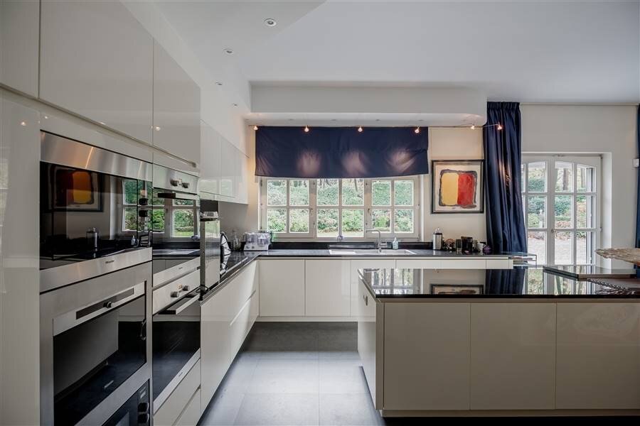 Large and luxurious kitchen equipped with all modern appliances such as 2 dishwashers, 2 ovens, 2 microwaves, 2 freezers, 2 refrigerators, a cool storage room and adjacent to the kitchen a bright veranda that is furnished as a dining area.