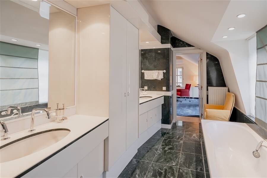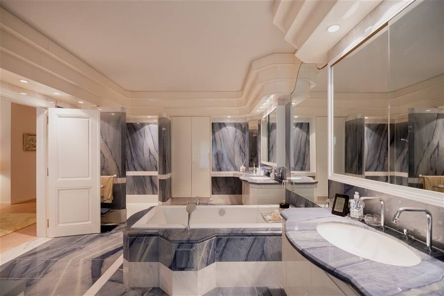 -Under the floating carpet in the living areas is an afzelia parquet, in the hall and corridor marble.
