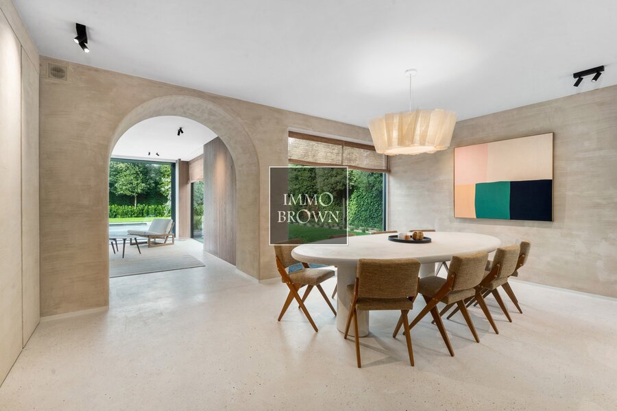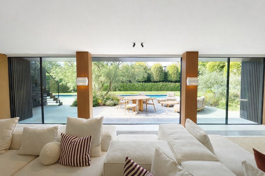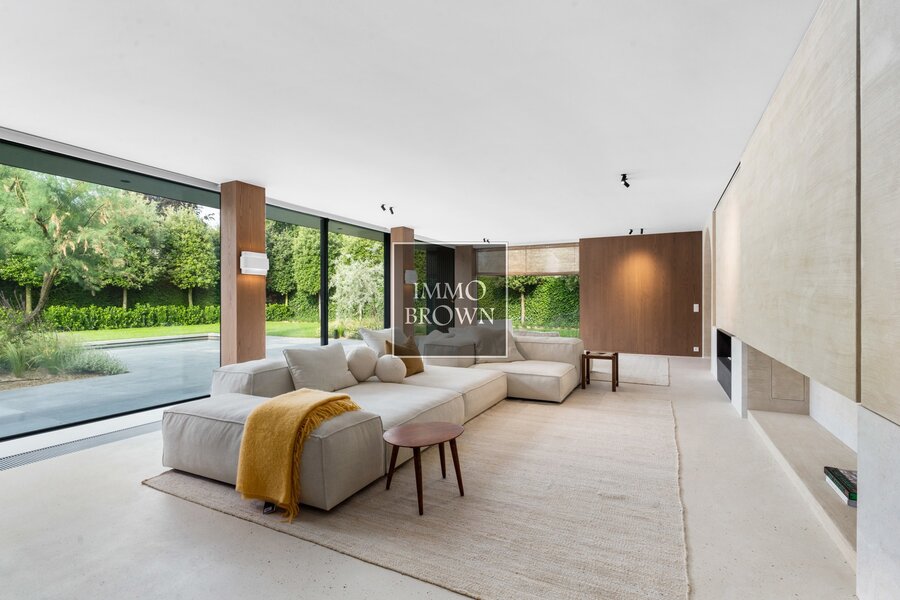 The entrance hall with cloakroom and guest toilet opens onto a bright and generous living area featuring a gas fireplace and large sliding windows overlooking the terrace and landscaped garden with heated outdoor swimming pool.