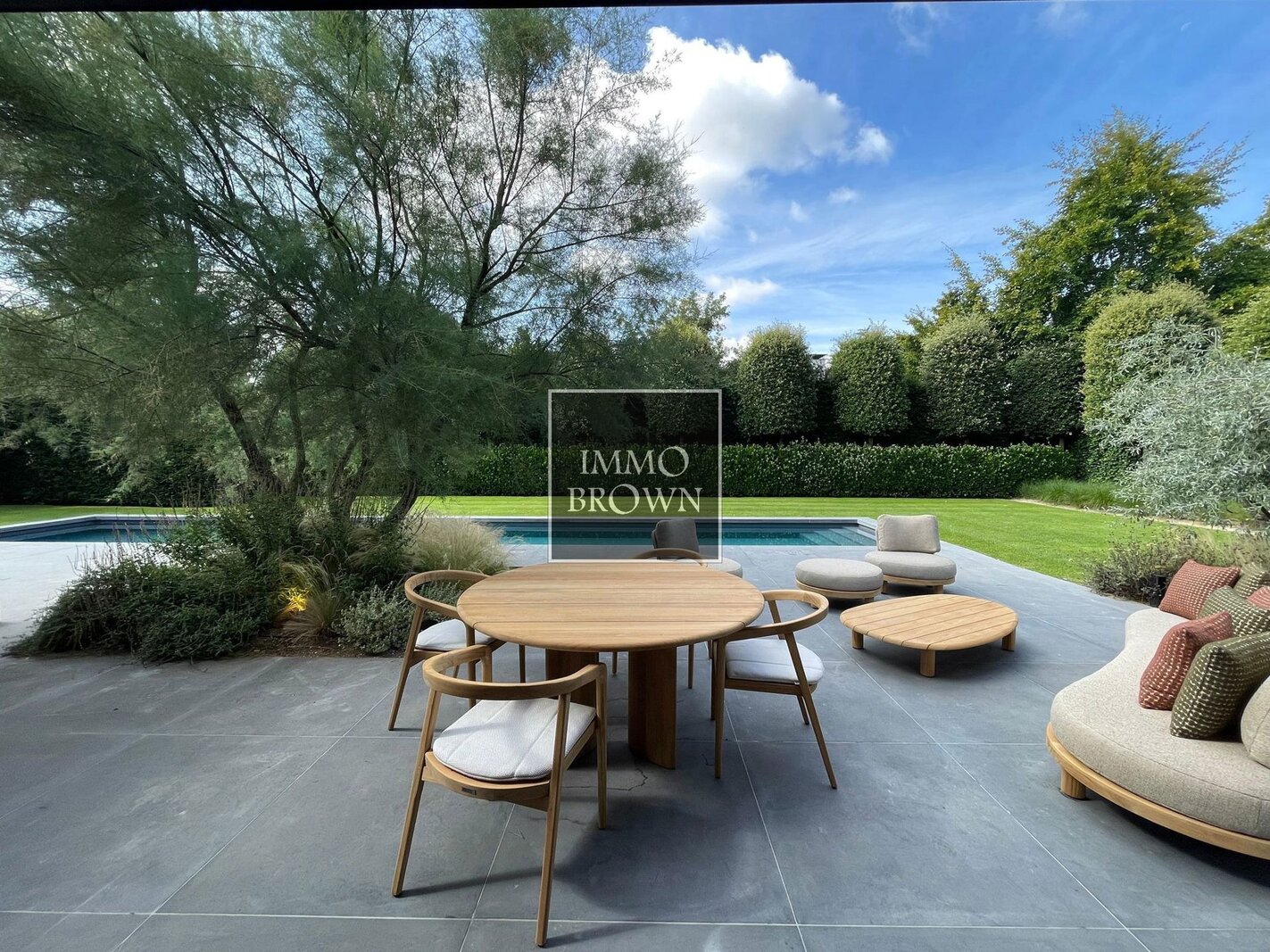 The professionally landscaped garden is fully enclosed and bordered by mature hedges, ensuring discretion and privacy. Thanks to its ideal southwest orientation, the terraces and pool area benefit from optimal sunlight throughout the day.