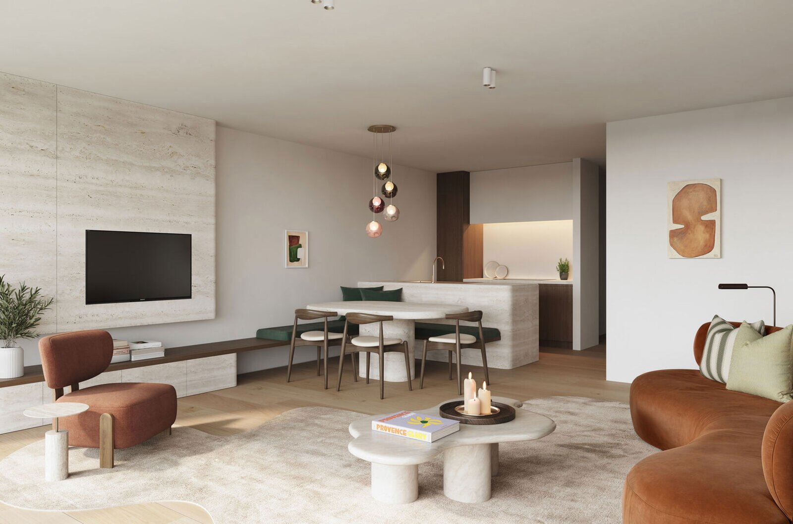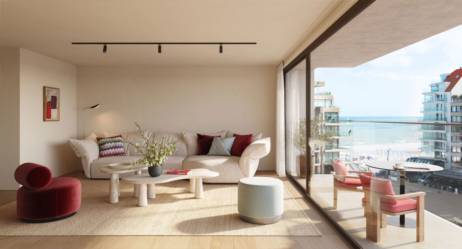 De appartementen beschikken over 2 slaapkamers, een mooie open keuken en een lichtrijke leefruimte die uitkomt op een terras met open zicht én zijdelings zeezicht – ideaal om te genieten van de frisse zeelucht en het levendige karakter van Knokke.