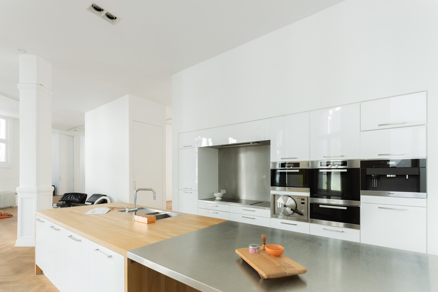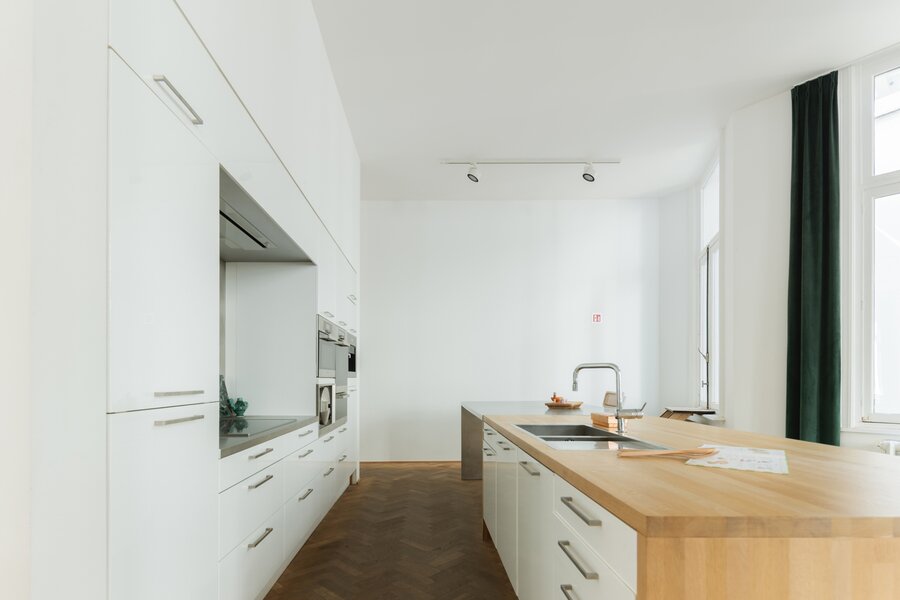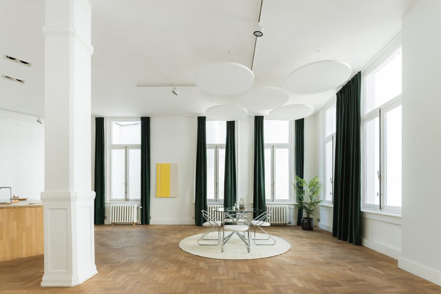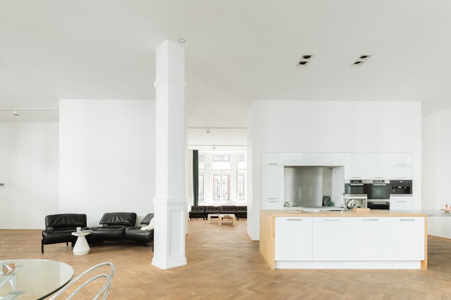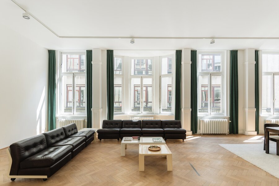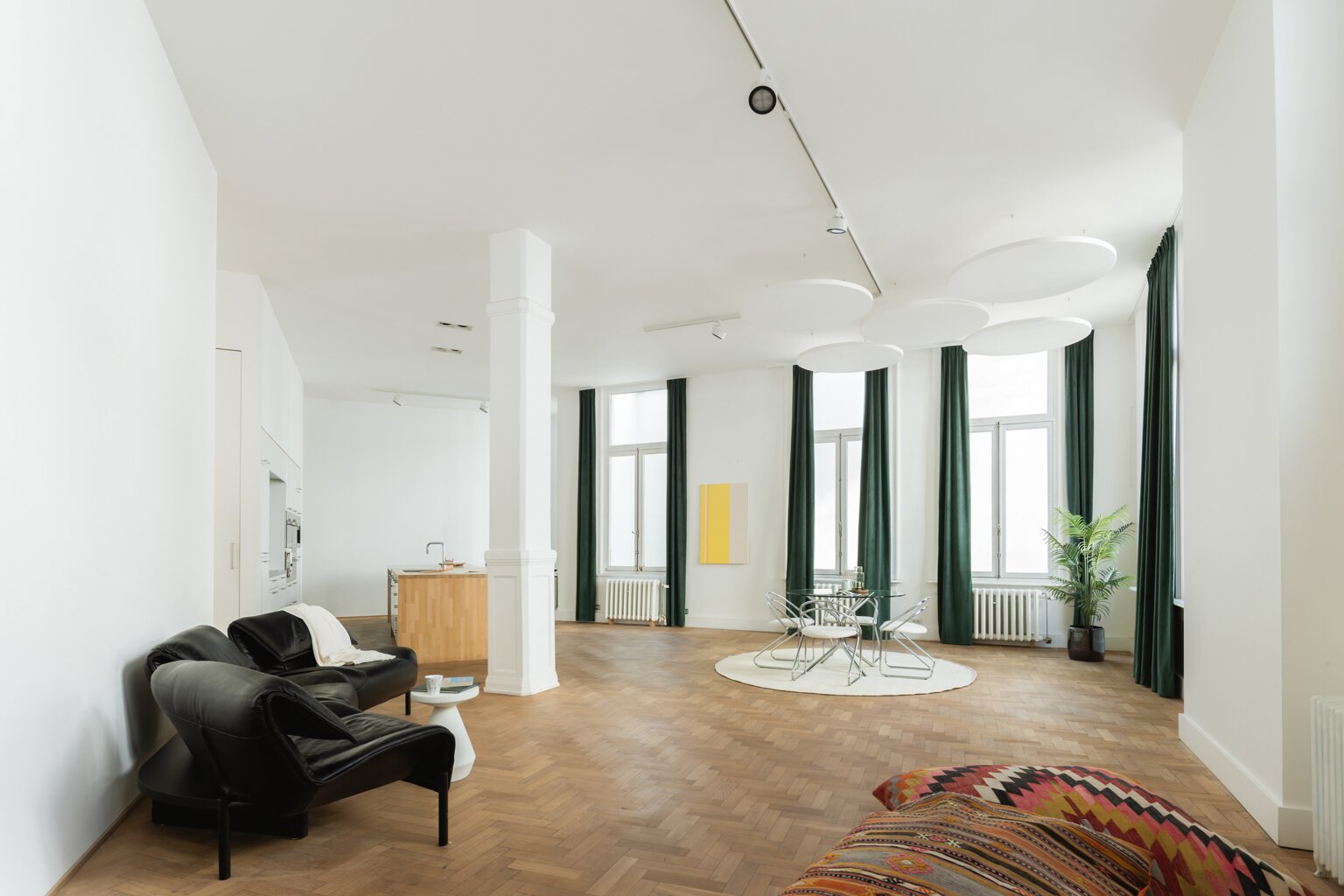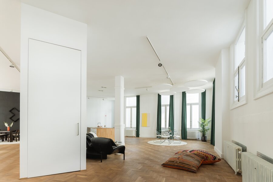In this first-floor flat, you are blown away by the five-metre-high ceilings, giga windows and the impressive amount of space - everywhere you look. At the centre are the hyper-fitted kitchen with large island, spacious dining room and ditto living space, which flow organically into each other. At either end of the loft, you find a master bedroom with bathroom on the left. To the right of the entrance door is the second bedroom, also with its own bathroom. Cherry on top: the cute terrace, where you can cool off in summer.