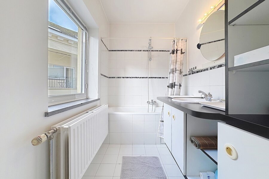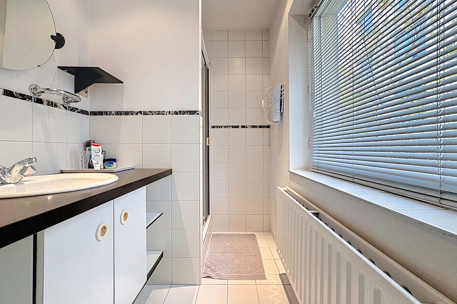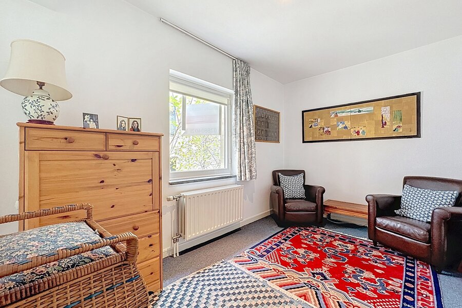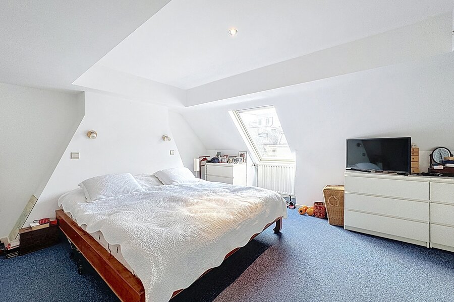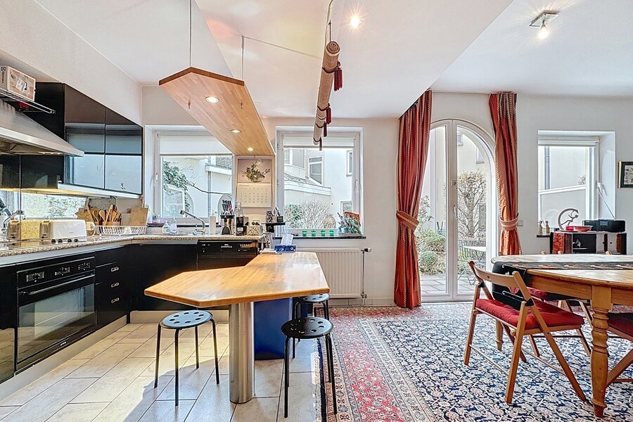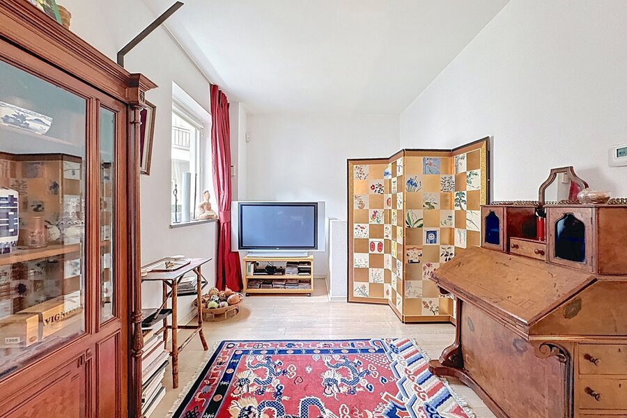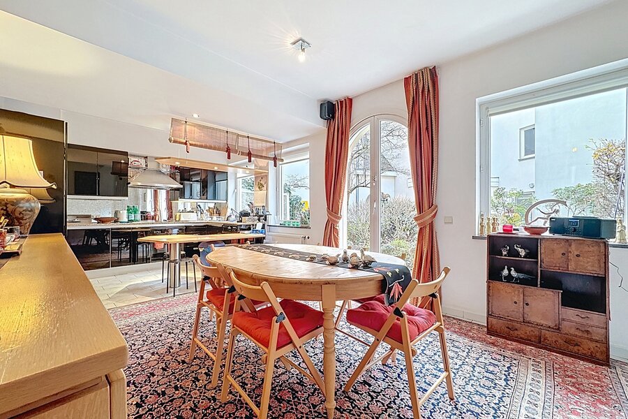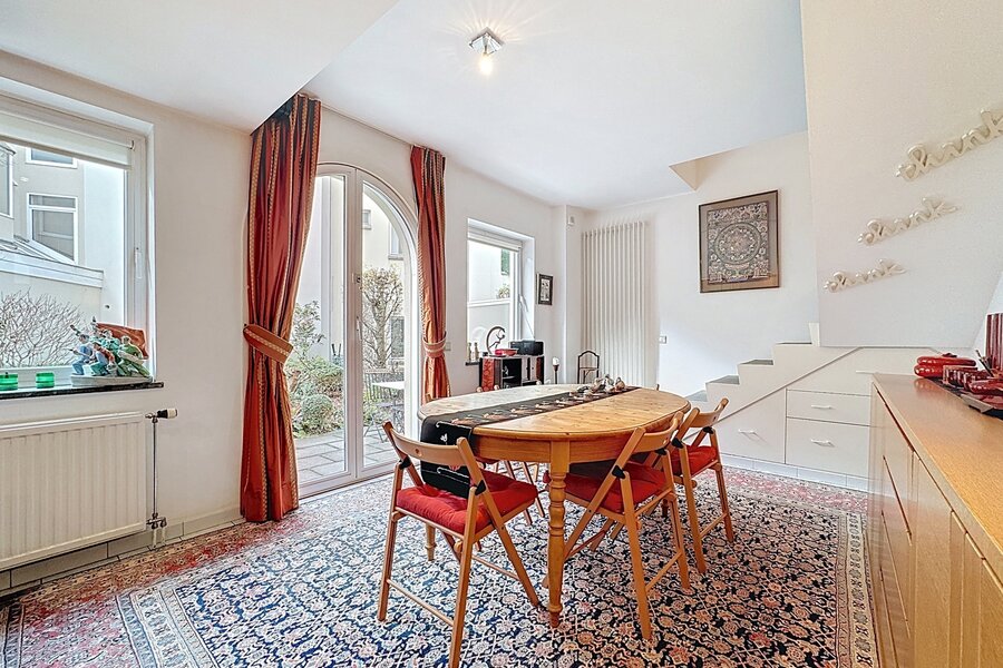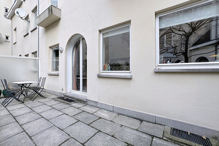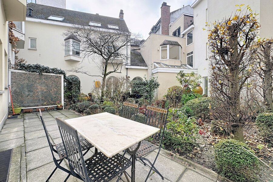 In the heart of Sablon, on a quiet street, this townhouse with two facades has a total surface area of ± 163m² and offers a beautiful outdoor space of ± 18m². It consists of a cloakroom, a separate toilet, a large living room with open kitchen, a lounge with TV corner and library, 3 bedrooms, two bathrooms, and a shower room.