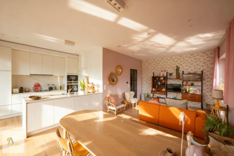 Woonkamer: Een magnifieke, lichtrijke living met hoge plafonds met een naadloze overgang naar het royale terras.