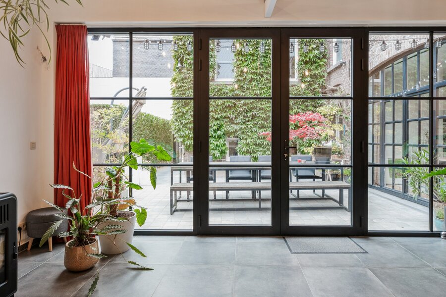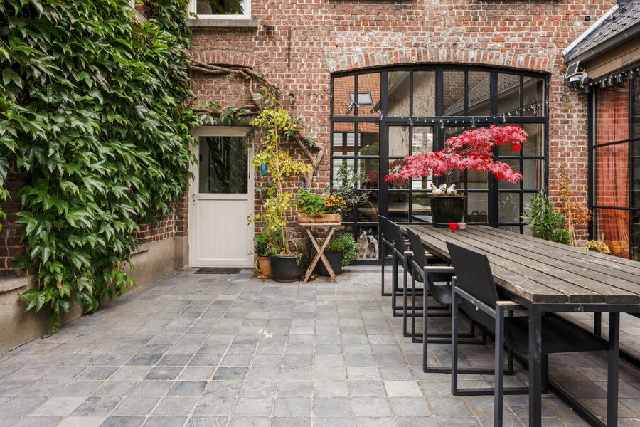 Tussen de herenwoning en de nieuwbouwwoning ligt een gezellige binnenplaats, een sfeervolle plek die beide gebouwen verbindt en uitnodigt tot samenzijn. Achteraan strekt zich een prachtige, diepe tuin uit: een oase van rust waar je volop kan genieten van het buitenleven. Bovendien is er achteraan een handige uitweg.