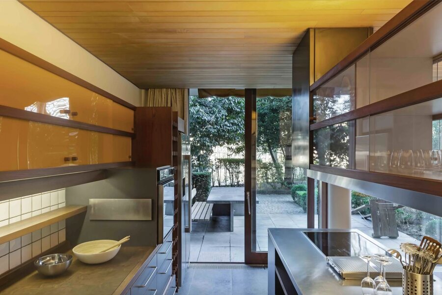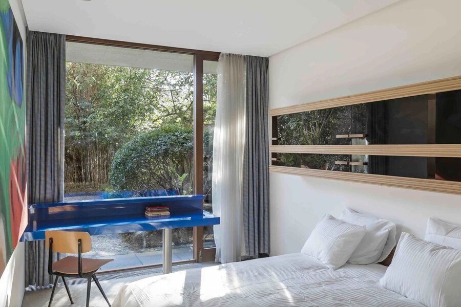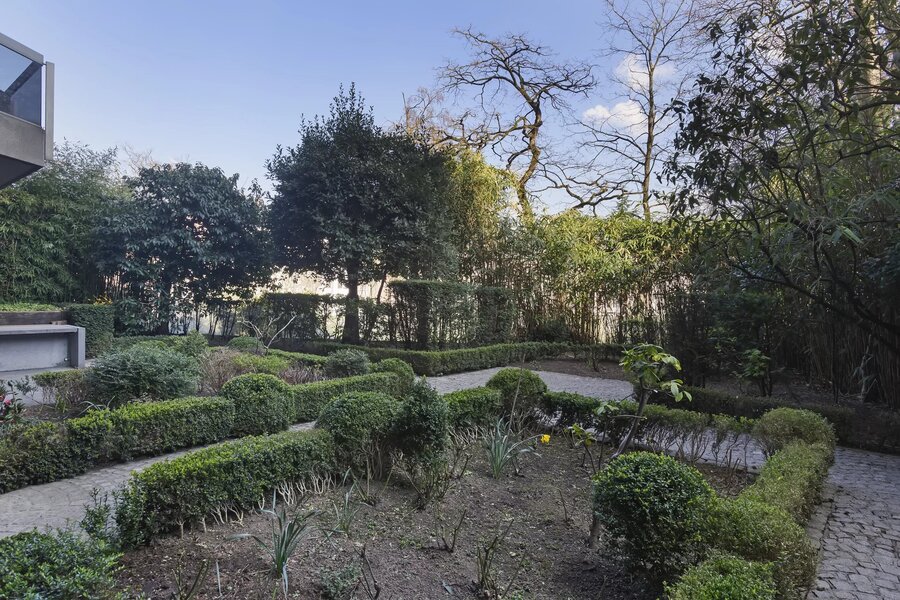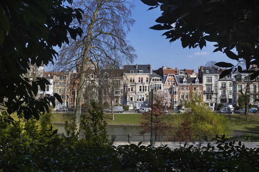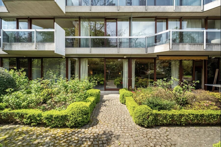 Bright 172 m² apartment on the first floor of a modernist building facing the Jardin du Roi, with a private 160 m² garden overlooking the Étangs d'Ixelles. Designed by Christophe Gevers, it comprises an entrance hall, a bright living room with fireplace, a fitted kitchen, a laundry room, three bedrooms (each with access to the garden, dressing room and bathroom) and an office. Direct elevator access to the apartment.
