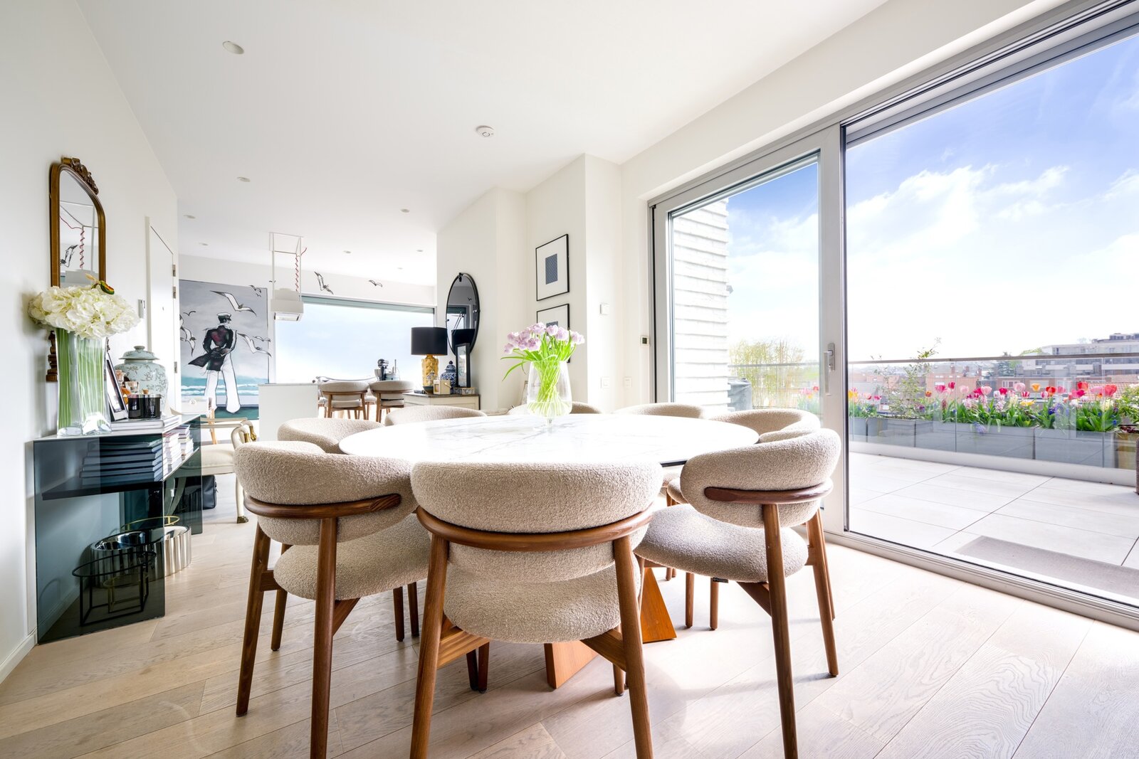 The property is laid out as follows: entrance hall, spacious reception areas of ±50 m² opening onto a beautifully oriented terrace, open-plan American kitchen with central island enjoying stunning views through large windows. The night hall is enhanced with custom-built cabinetry. There are 3 bedrooms with built-in wardrobes, including a master suite with dressing room and an en-suite bathroom (bathtub, shower, toilet). A second bathroom with toilet, a laundry room, and a boiler room complete the layout.
