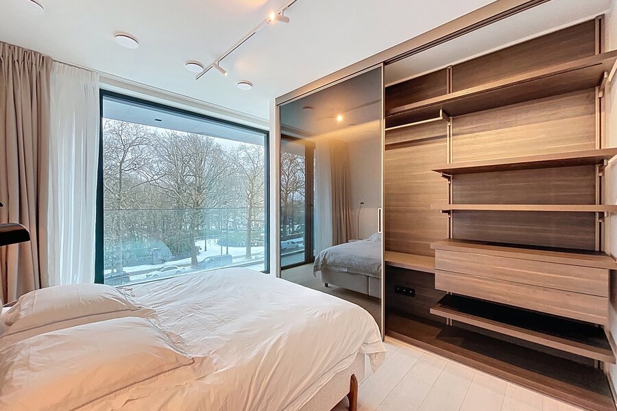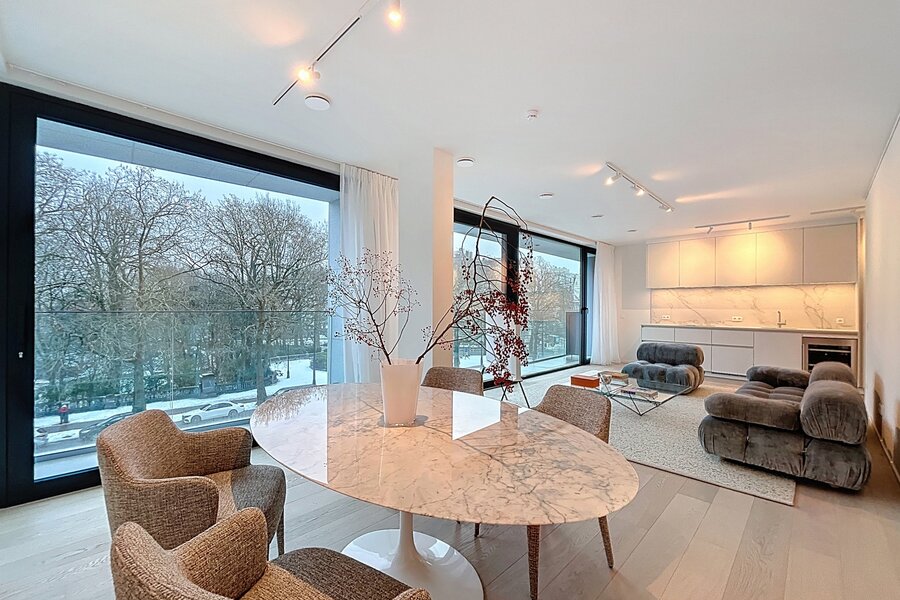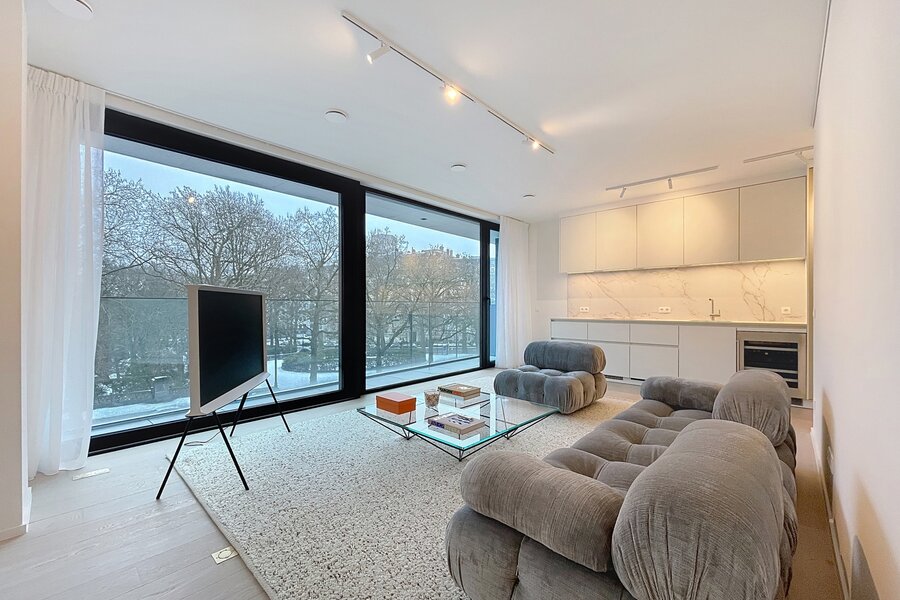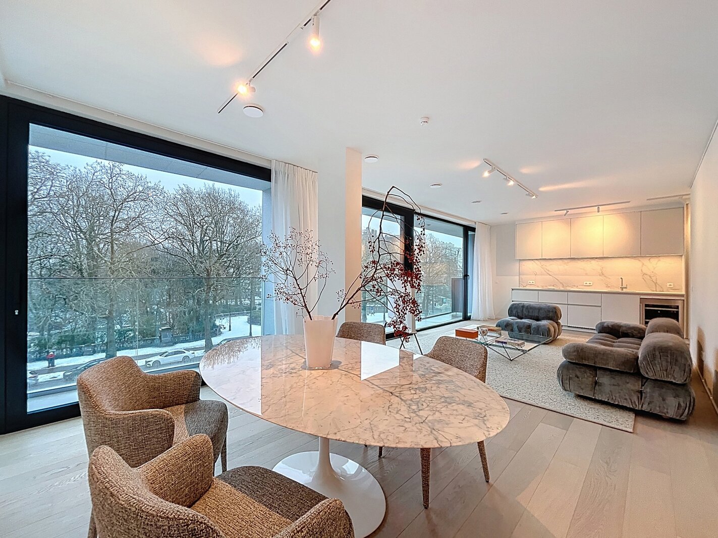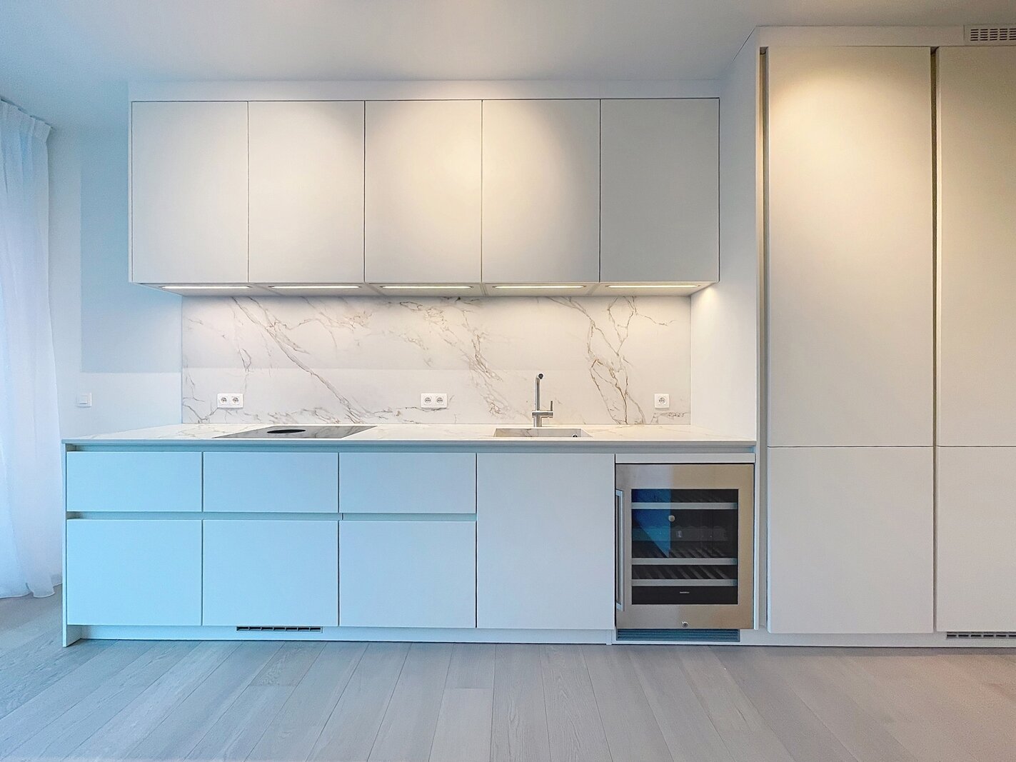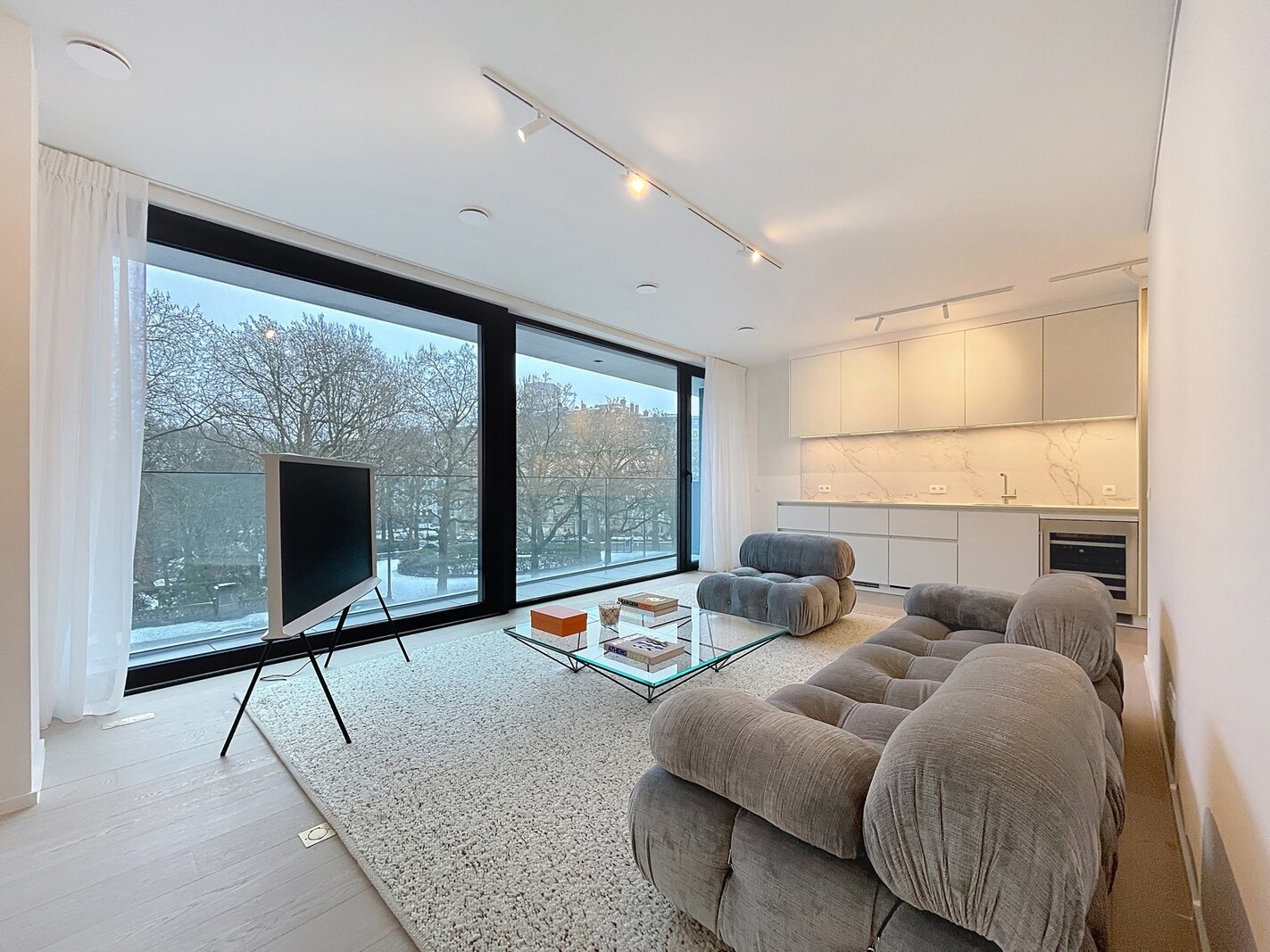 Facing La Cambre Abbey and in close proximity to the Bois de la Cambre park and Place Flagey, this sumptuous new apartment offers approximately 81 m² of living space in the prestigious Metropolitan residence. It comprises an entrance hall, a spacious living/dining room (approximately 36 m²) with a fully equipped kitchen (Gaggenau appliances), a beautiful bedroom (approximately 14 m²) with custom-made Rimadesio wardrobes, a shower room, a fully equipped laundry room, a utility room, and a separate WC. A large balcony (approximately 11 m²) is accessible from both the living room and the bedroom. A cellar in the second basement level is included, and an indoor parking space (with electric vehicle charging available) in the fourth basement level is available for an additional €150/month. The apartment features a reinforced door, video intercom, Niko Home Control home automation system, ample custom storage, curtains, a washer-dryer, triple glazing, a dual-flow ventilation system, and a heat pump. A gym and sauna are located on the first basement level of the building. Monthly charges: €125 (provision for maintenance of common areas). Energy Performance Certificate (EPC) rating: A. Don't miss out, contact Vaneau Lecobel today!