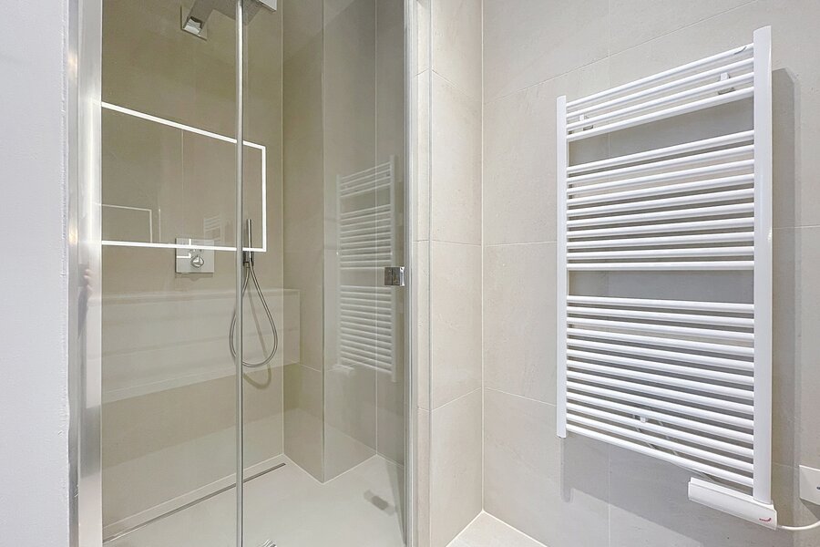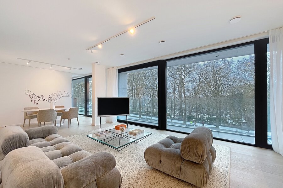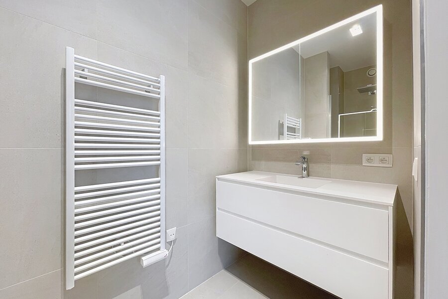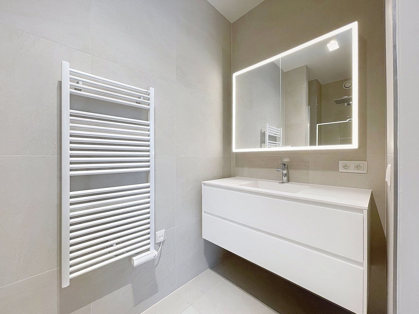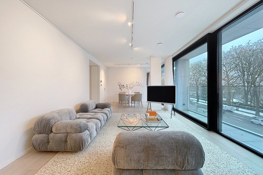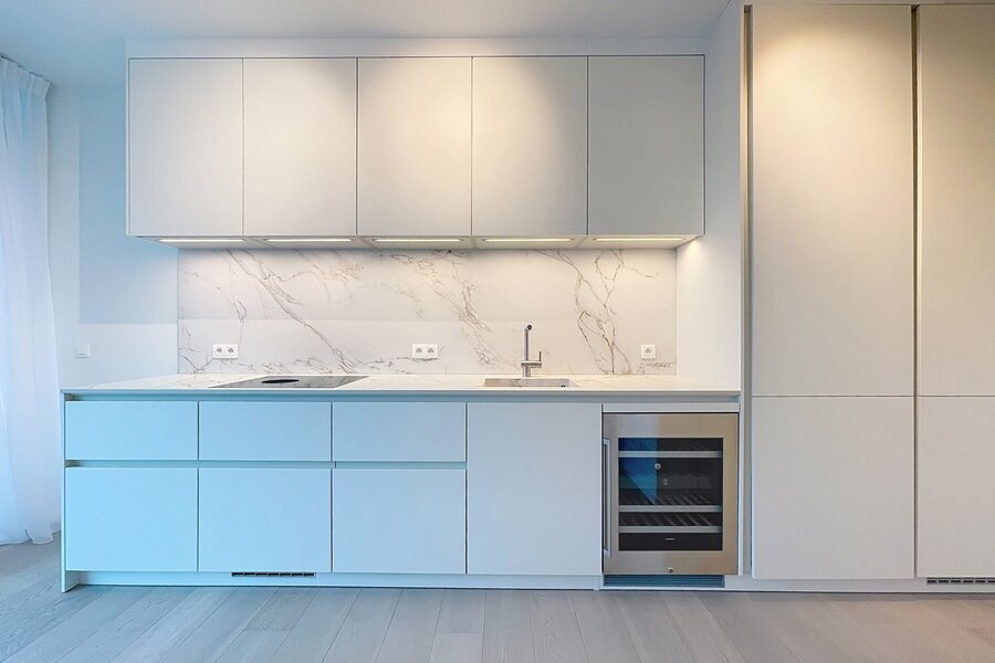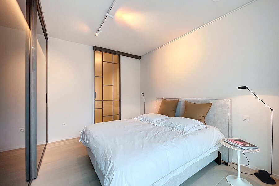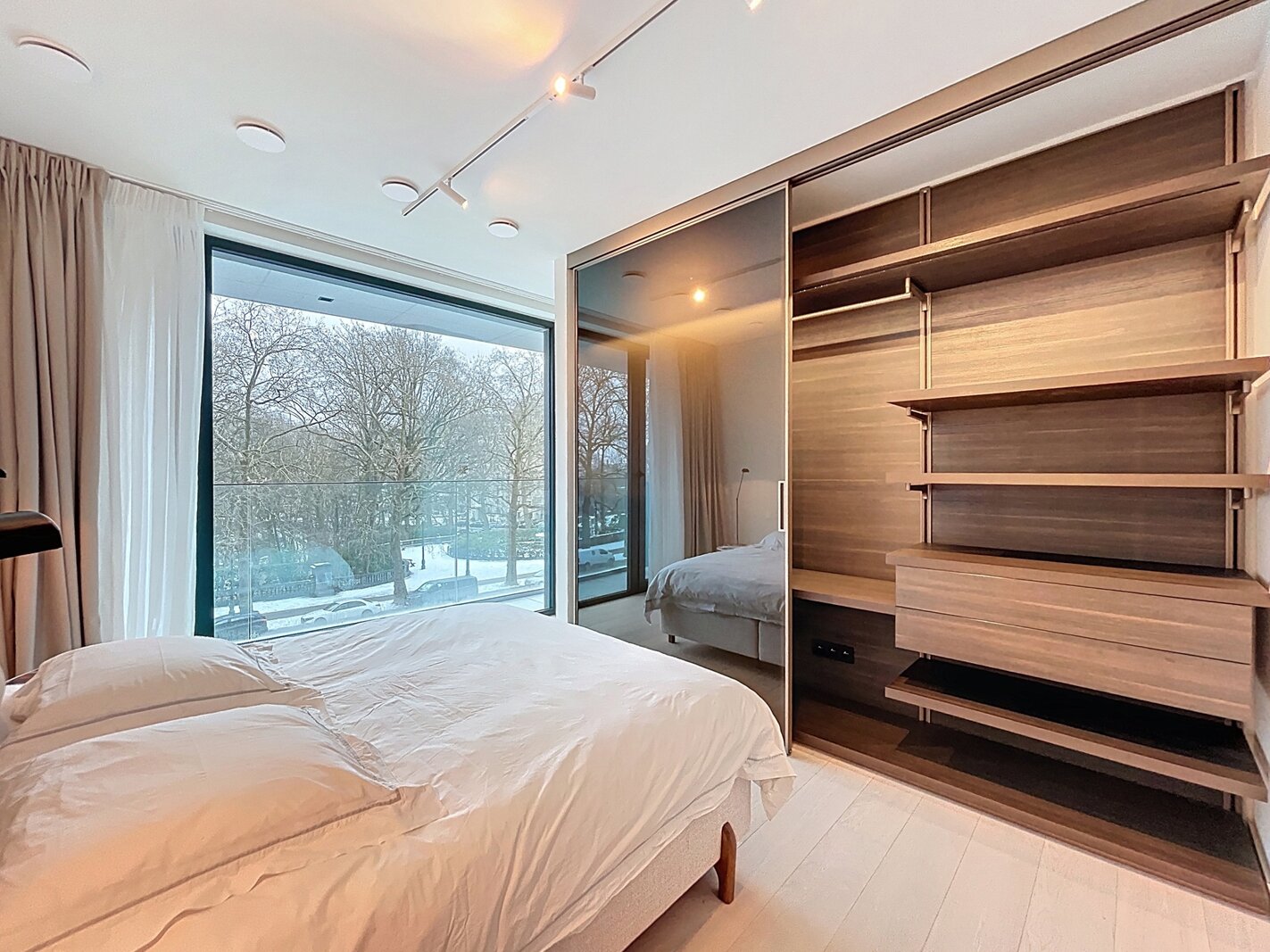 Facing La Cambre Abbey and in close proximity to the Bois de la Cambre park and Place Flagey, this sumptuous new apartment offers approximately 81 m² of living space in the prestigious Metropolitan residence. It comprises an entrance hall, a spacious living/dining room (approximately 36 m²) with a fully equipped kitchen (Gaggenau appliances), a beautiful bedroom (approximately 14 m²) with custom-made Rimadesio wardrobes, a shower room, a fully equipped laundry room, a utility room, and a separate WC. A large balcony (approximately 11 m²) is accessible from both the living room and the bedroom. A cellar in the second basement level is included, and an indoor parking space (with electric vehicle charging available) in the fourth basement level is available for an additional €150/month. The apartment features a reinforced door, video intercom, Niko Home Control home automation system, ample custom storage, curtains, a washer-dryer, triple glazing, a dual-flow ventilation system, and a heat pump. A gym and sauna are located on the first basement level of the building. Monthly charges: €125 (provision for maintenance of common areas). Energy Performance Certificate (EPC) rating: A. Don't miss out, contact Vaneau Lecobel today!