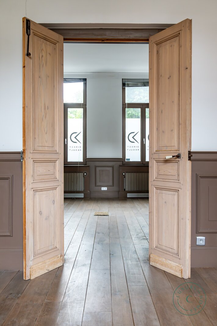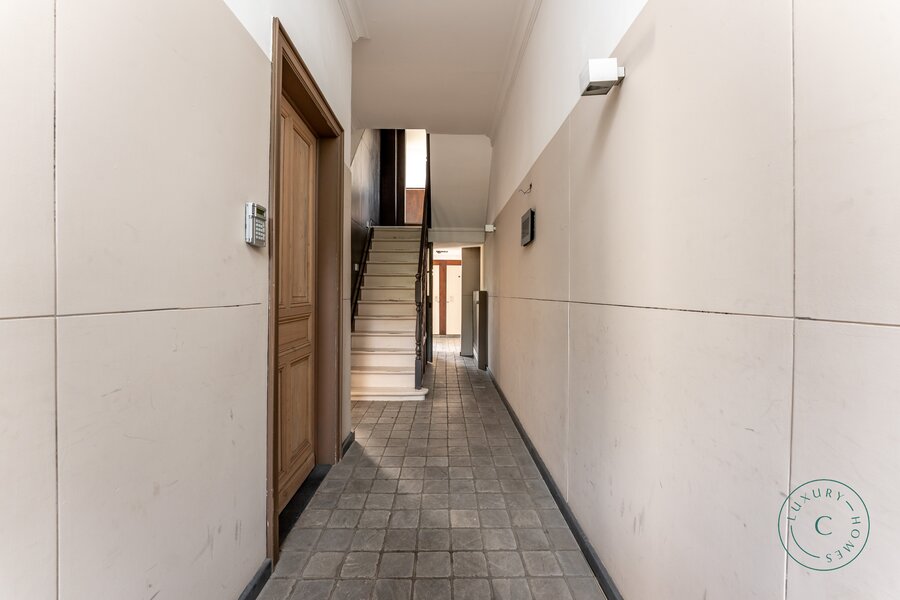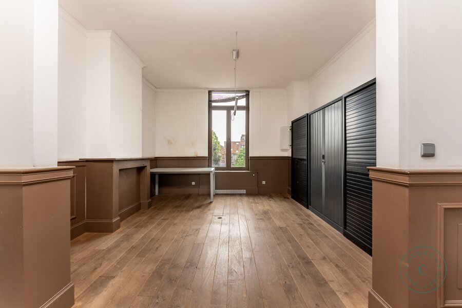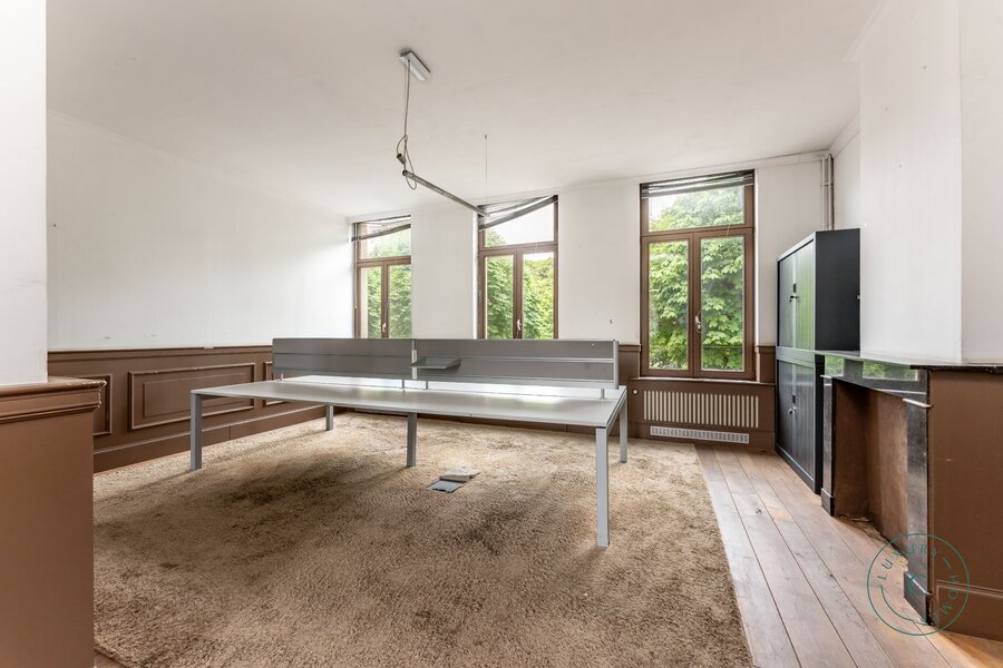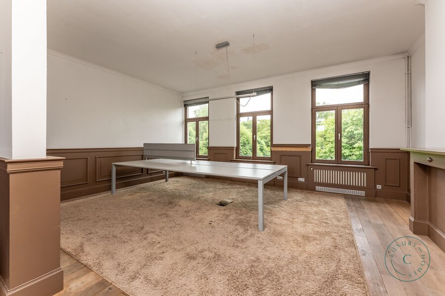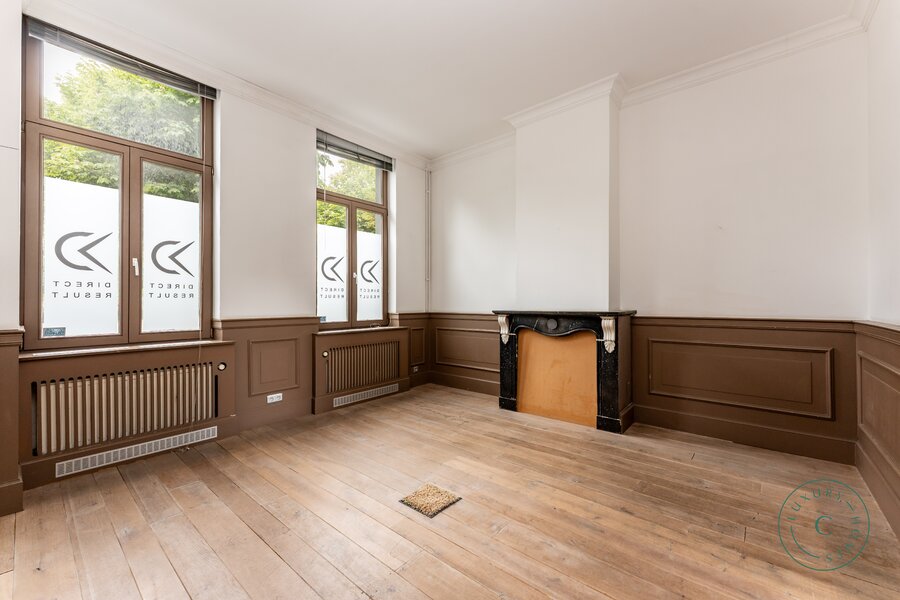 Via een ruime inkomhal betreedt u de woning, links bevindt zich een lichtrijke leefruimte met originele parketvloer, sierhaarden en zicht op het groen. Deze ruimte leent zich perfect als stijlvolle woonkamer met eetplaats, maar kan ook ingericht worden als bureau of praktijkruimte voor wie wonen en werk wenst te combineren. Aansluitend is er plaats voor een ruime keuken die toegang biedt tot het zonnige binnenterras.
