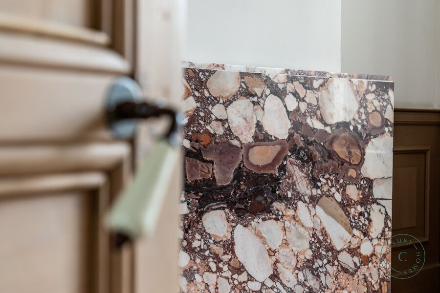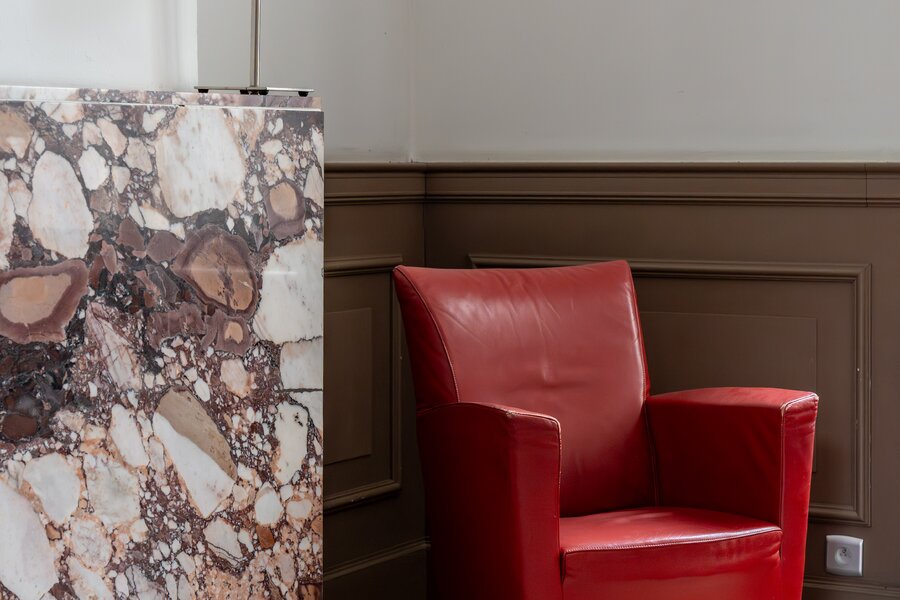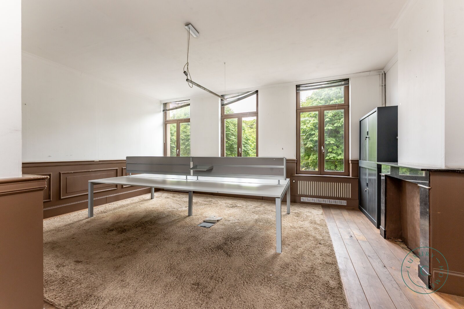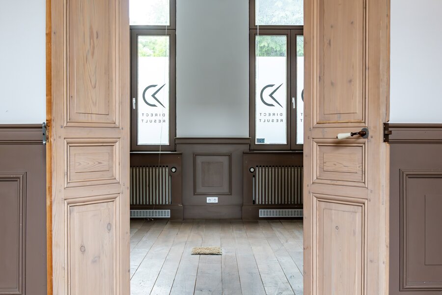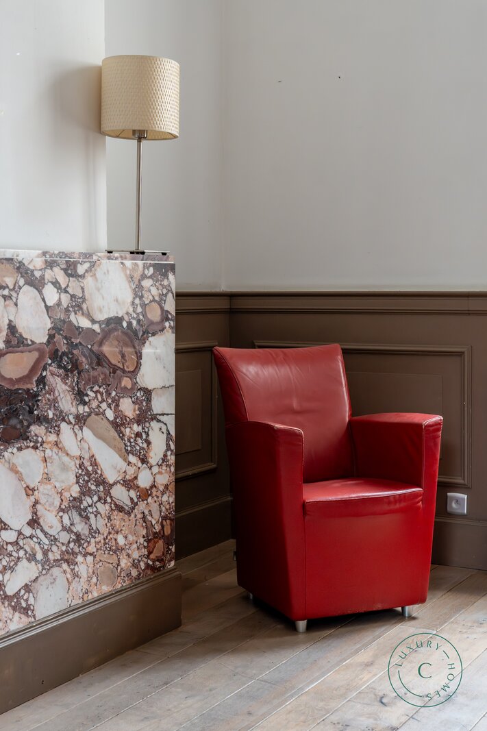 Via een ruime inkomhal betreedt u de woning, links bevindt zich een lichtrijke leefruimte met originele parketvloer, sierhaarden en zicht op het groen. Deze ruimte leent zich perfect als stijlvolle woonkamer met eetplaats, maar kan ook ingericht worden als bureau of praktijkruimte voor wie wonen en werk wenst te combineren. Aansluitend is er plaats voor een ruime keuken die toegang biedt tot het zonnige binnenterras.