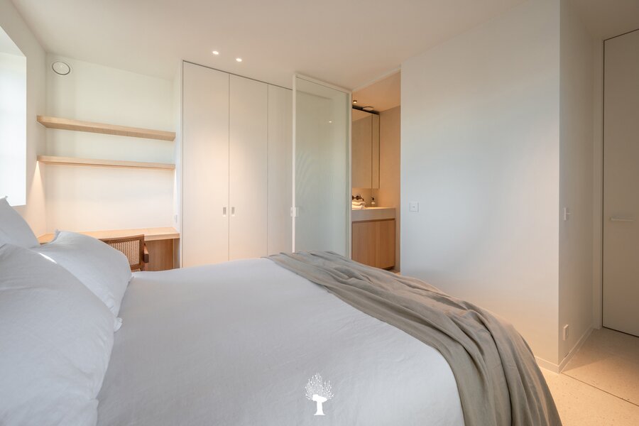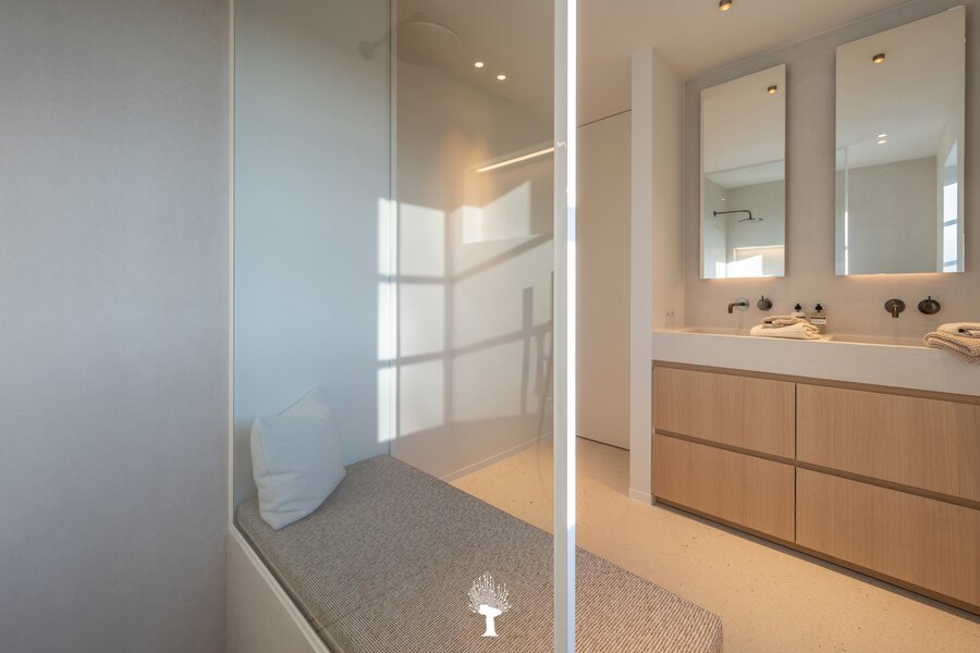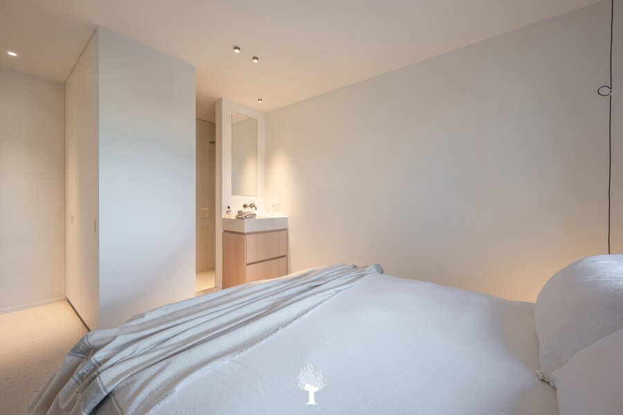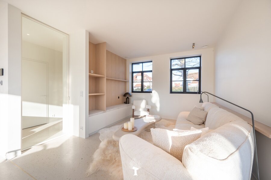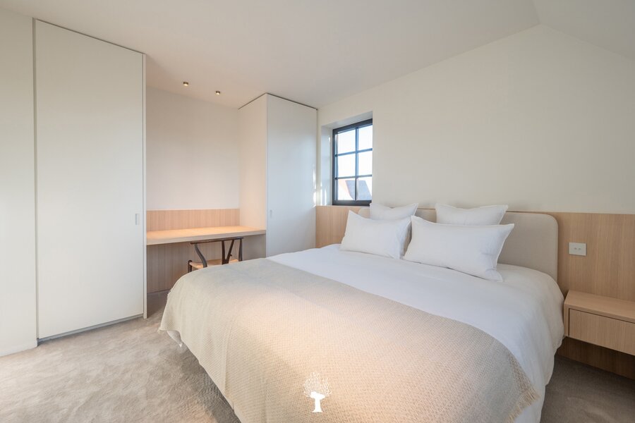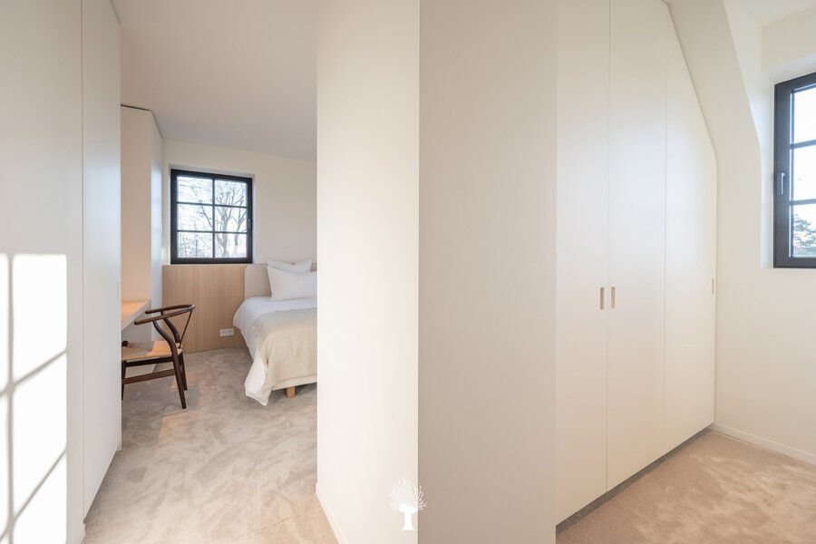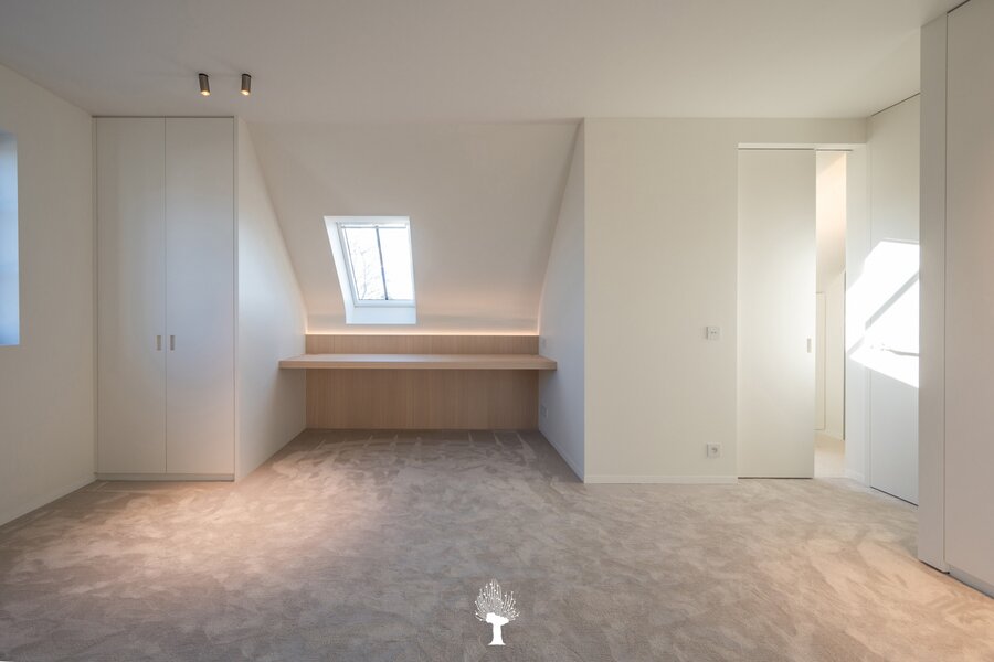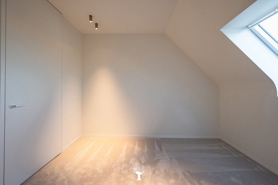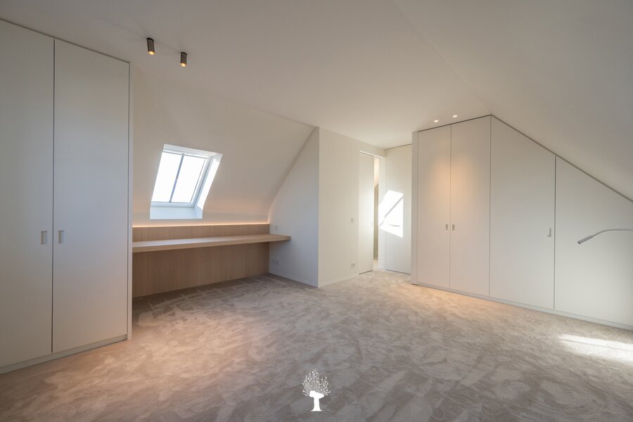 Eerste verdieping: drie ruime slaapkamers, allen voorzien van inbouwkasten en een eigen badkamer. De master suite is uitgerust met een ensuite badkamer, een ruime dressing en hoogwaardige afwerkingen in forcrete en terrazzo. Op de bovenste verdieping vindt u een vierde slaapkamer, die beschikt over een bureelhoek en een eigen douchekamer. Verder is er een polyvalente vijfde kamer, die naar wens kan worden ingericht als extra slaapkamer, hobbyruimte of ontspanningsruimte. De woning beschikt bovendien over een inpandige garage en een praktische wasruimte met directe toegang tot de tuin, wat het ideaal maakt voor gezinnen die op zoek zijn naar zowel luxe als functionaliteit. Deze instapklare villa op een toplocatie biedt een exclusieve woonervaring, waar stijl en comfort centraal staan.