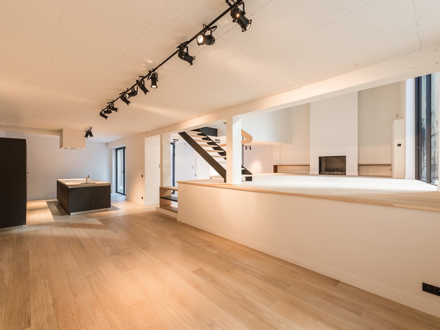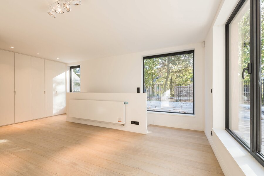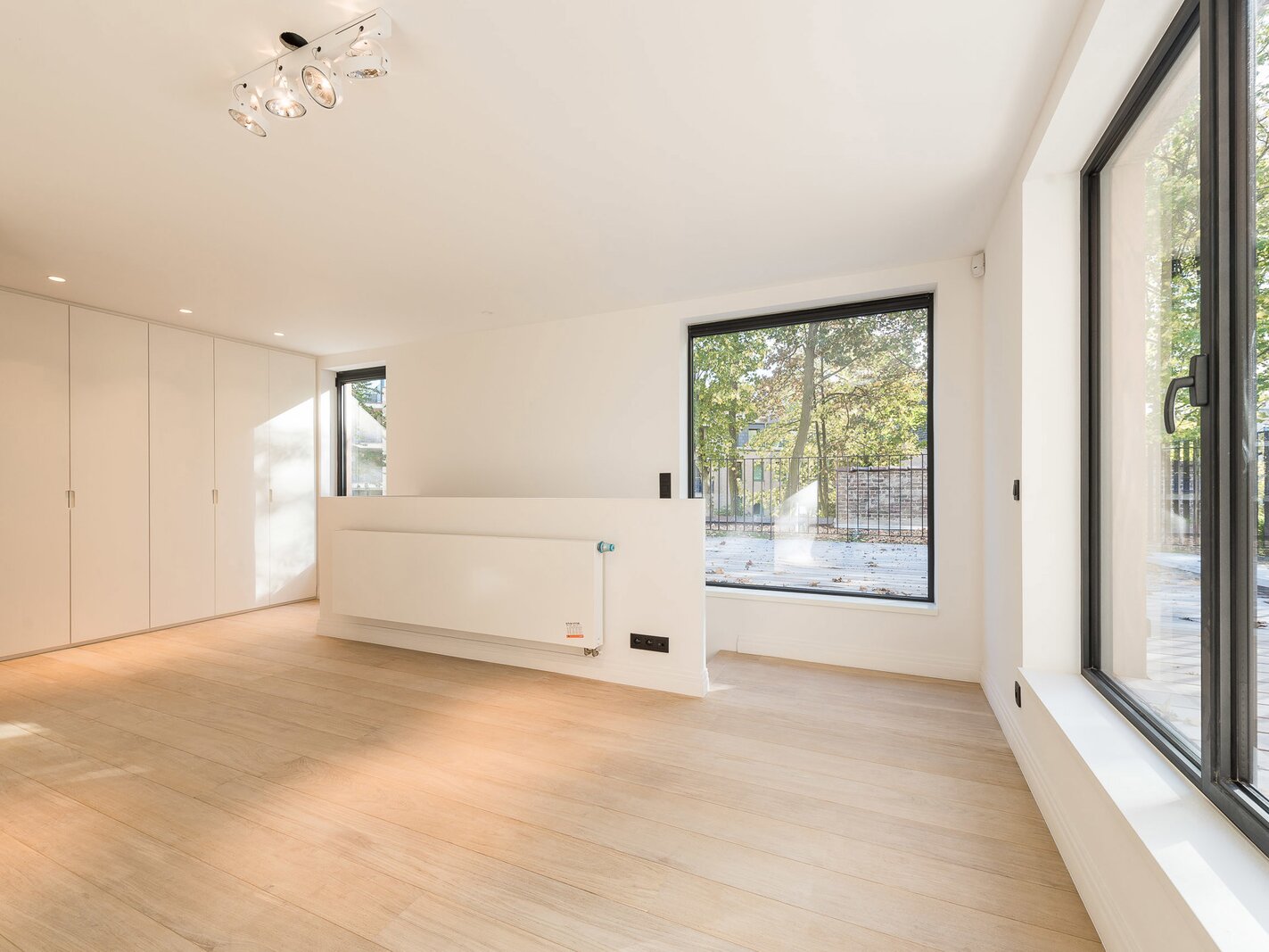 The contemporary, loft-style house opens onto light-filled living spaces thanks to large bay windows overlooking the ideally oriented southwest-facing garden, which offers unobstructed views. These spaces comprise a spacious living room, a dining room, and a fully equipped Bulthaup kitchen with an adjoining utility/laundry room. A separate office completes this level. On the first floor, there is a master bedroom with a dressing room and en-suite bathroom, and two further bedrooms, each with a dressing room and en-suite bathroom. On the second floor, a fourth bedroom with a dressing room and bathroom provides access to a second terrace.