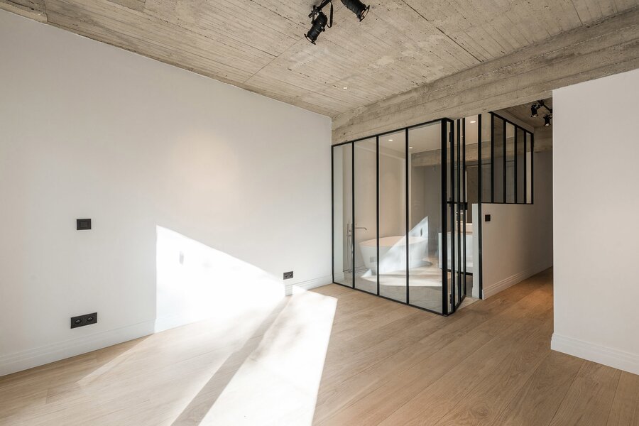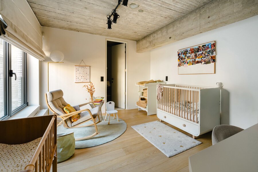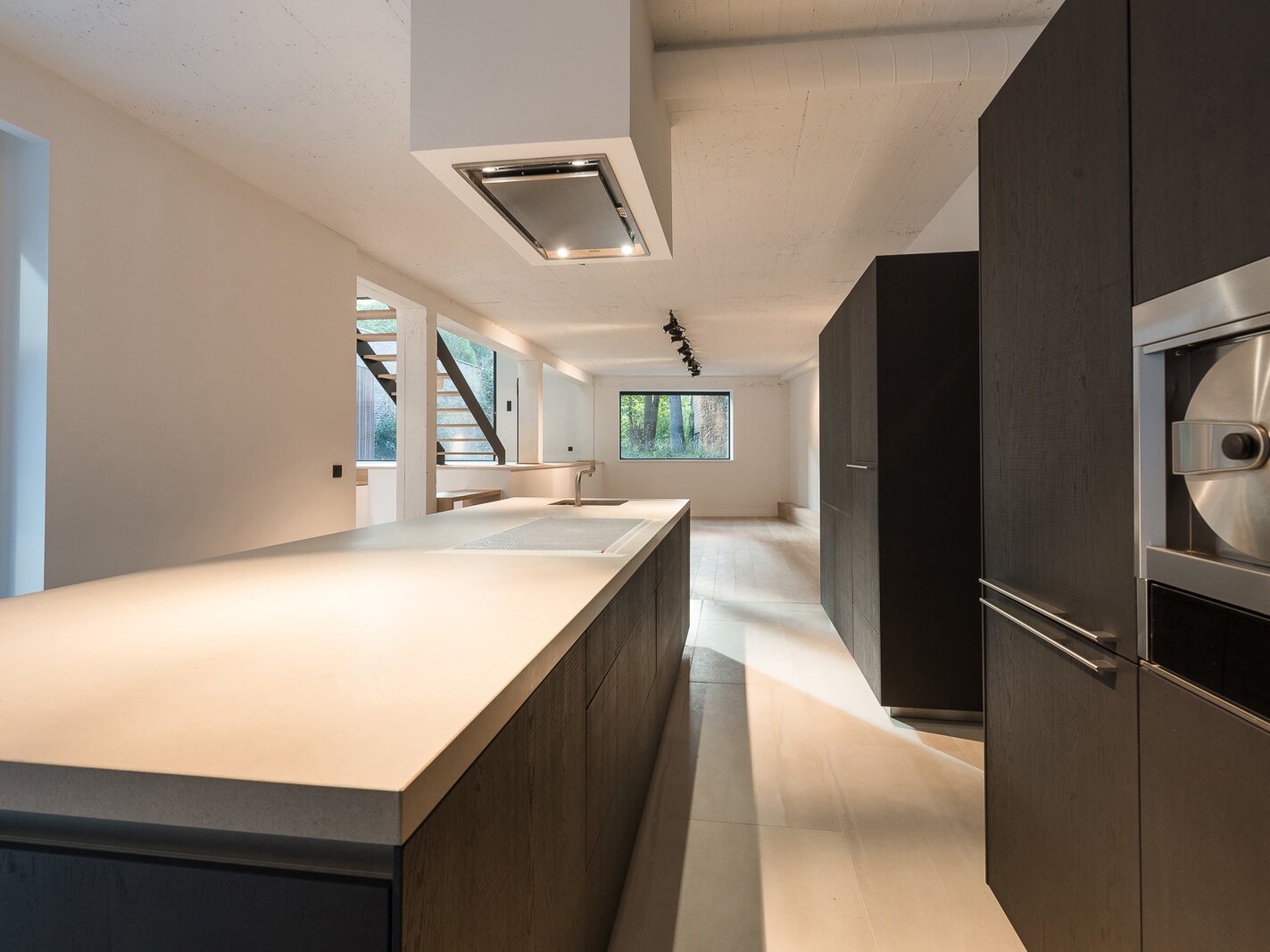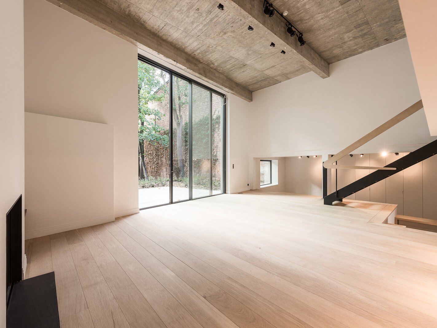 The contemporary, loft-style house opens onto light-filled living spaces thanks to large bay windows overlooking the ideally oriented southwest-facing garden, which offers unobstructed views. These spaces comprise a spacious living room, a dining room, and a fully equipped Bulthaup kitchen with an adjoining utility/laundry room. A separate office completes this level. On the first floor, there is a master bedroom with a dressing room and en-suite bathroom, and two further bedrooms, each with a dressing room and en-suite bathroom. On the second floor, a fourth bedroom with a dressing room and bathroom provides access to a second terrace.