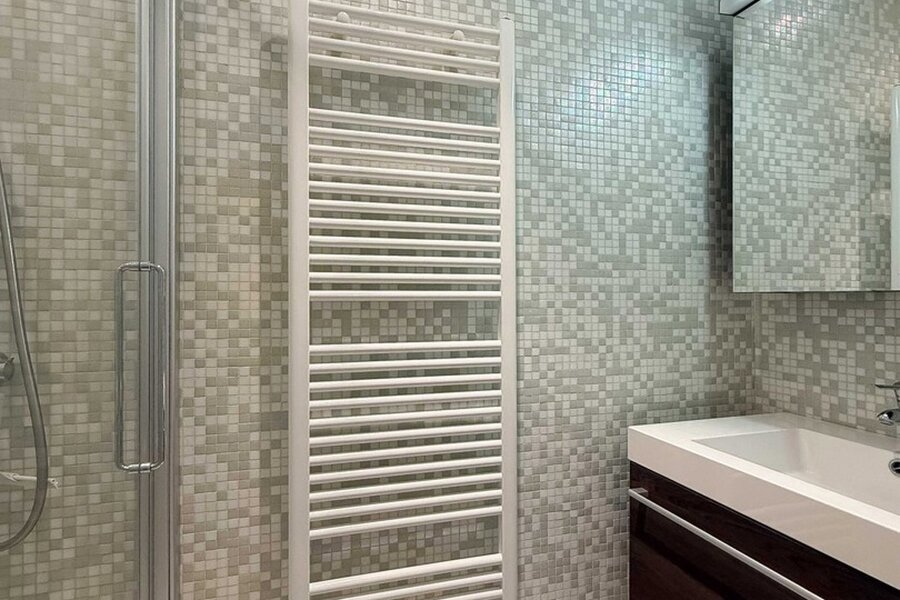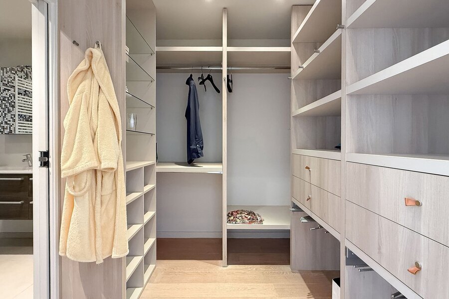 The master bedroom includes a dressing area and an en-suite bathroom with bathtub, toilet and double washbasin. There is also a second spacious bedroom, a separate shower room, and a third bedroom with its own bathroom (bathtub and washbasin) and technical storage. All bedrooms have access to the rear terrace and are fitted with automatic shutters.