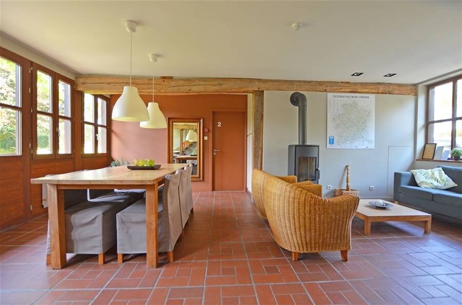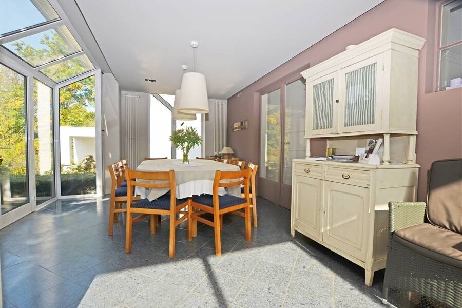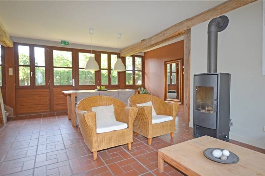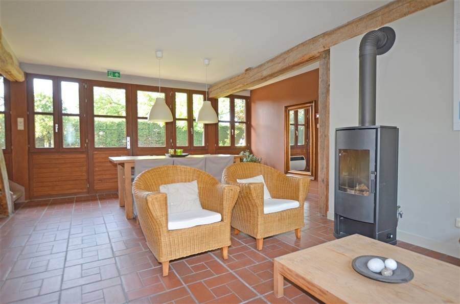 Via de inkomhal met gastentoilet betreden we enerzijds het leefgedeelte met een L-vormige woonkamer en eetkamer waar een open haard voor extra gezelligheid zorgt. Aansluitend bevindt zich de ruime leefkeuken met tuinkamer die dienst doet als tweede eetplaats en dankzij de grote raampartijen rechtstreeks in contact staat met de tuin.