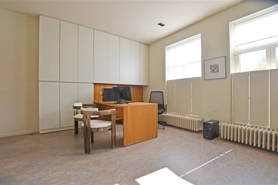 Anderzijds leidt de inkomhal naar de praktijkruimte met een bijkomende bureauruimte en een aparte wachtzaal, ideaal voor wie wonen en werken wil combineren.