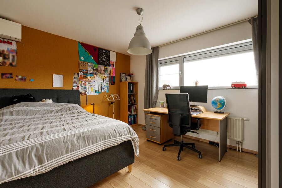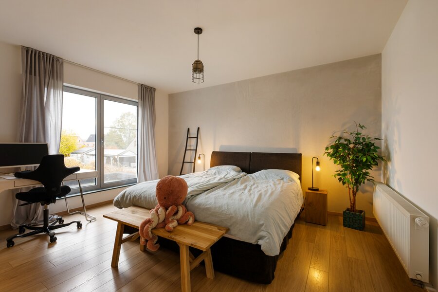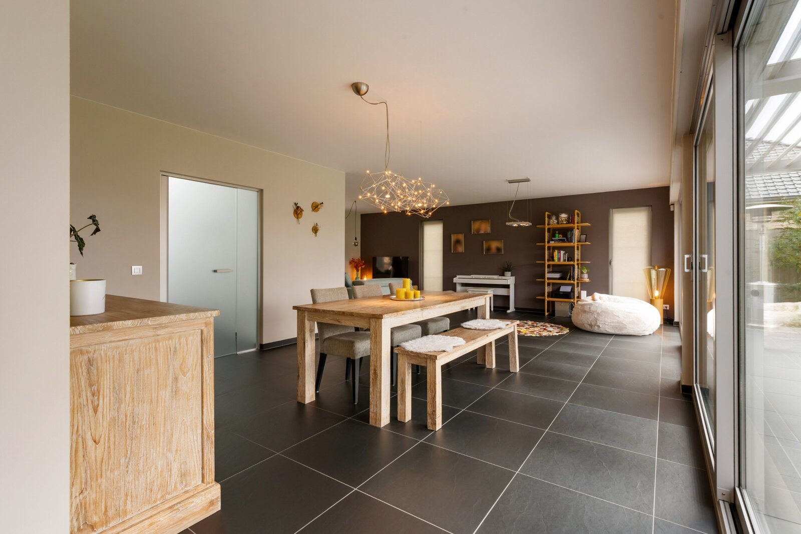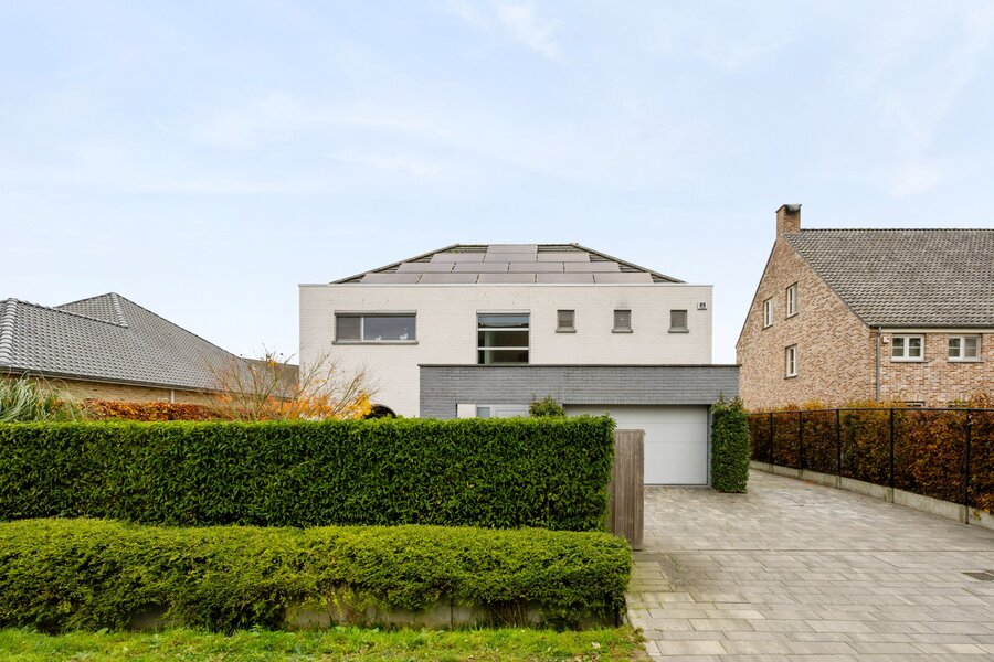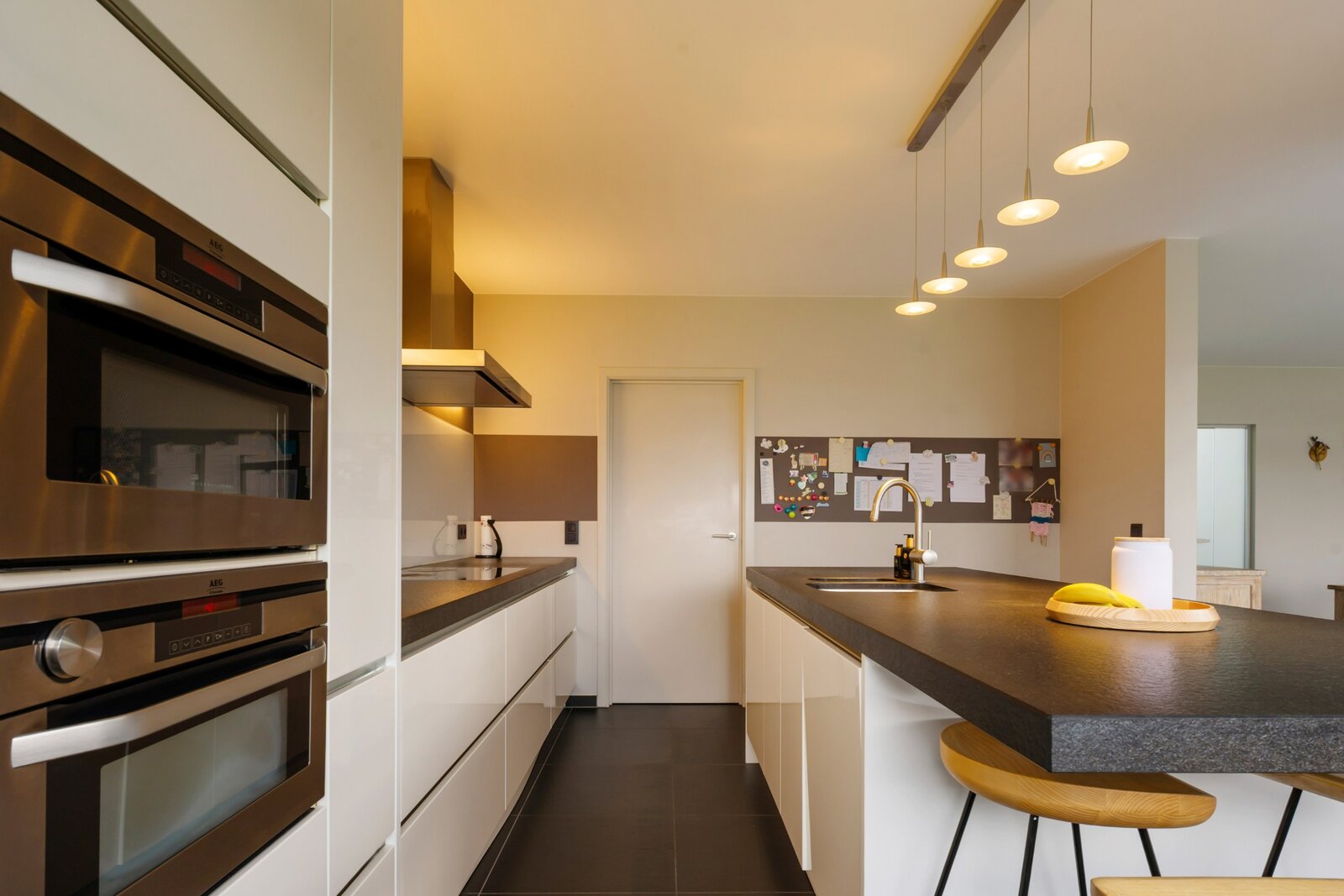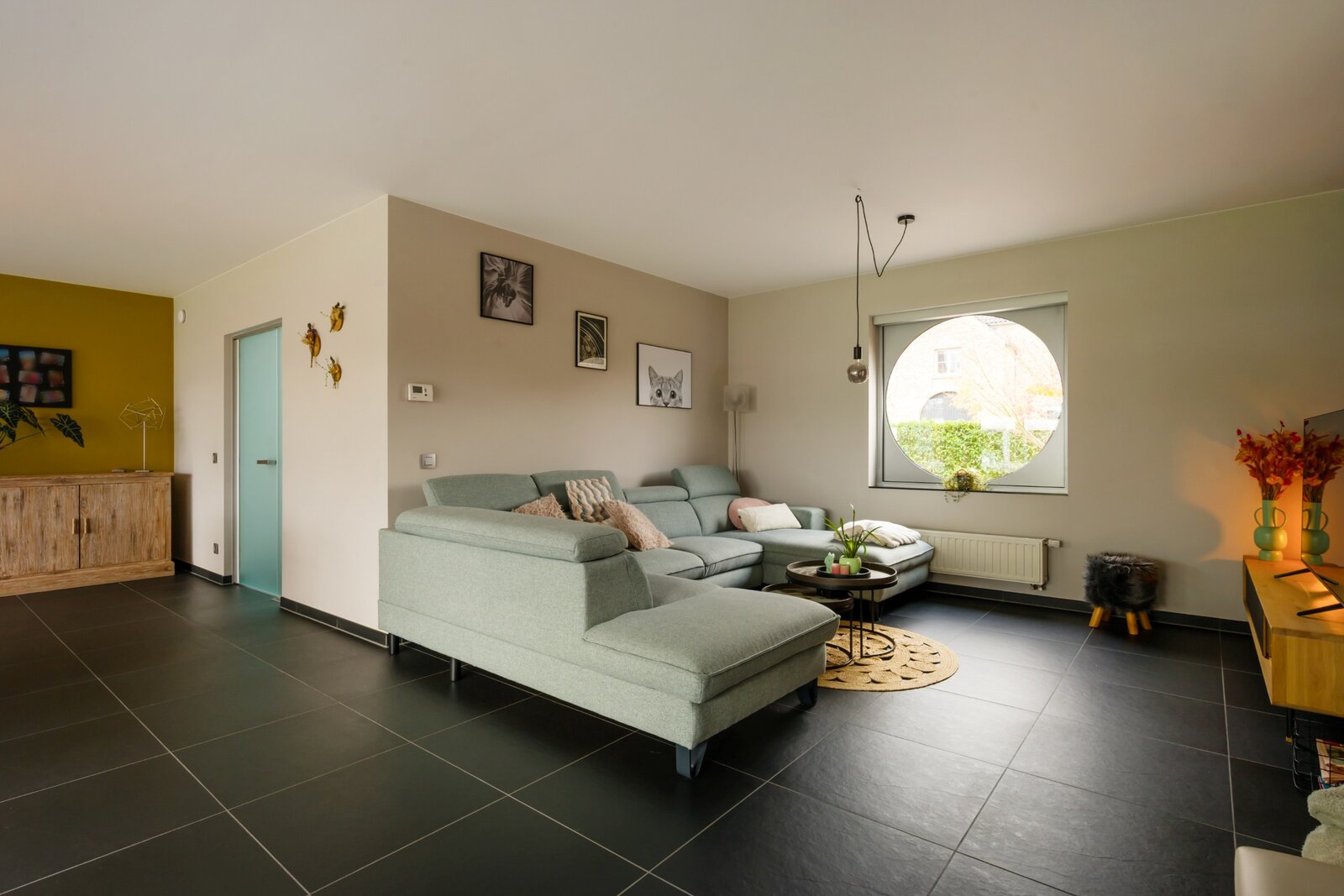 Bij het betreden van de woning komen we in een lichtrijke inkomhal met gastentoilet en handige opbergruimte. De ruime en gezellige leefruimte sluit perfect aan op de volledig ingerichte keuken en biedt een mooi open zicht op de tuin. Aansluitend vinden we een ruime berging met toegang tot de garage, die uitgerust is met een laadpaal voor elektrische wagens.