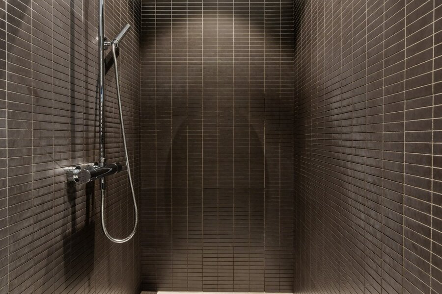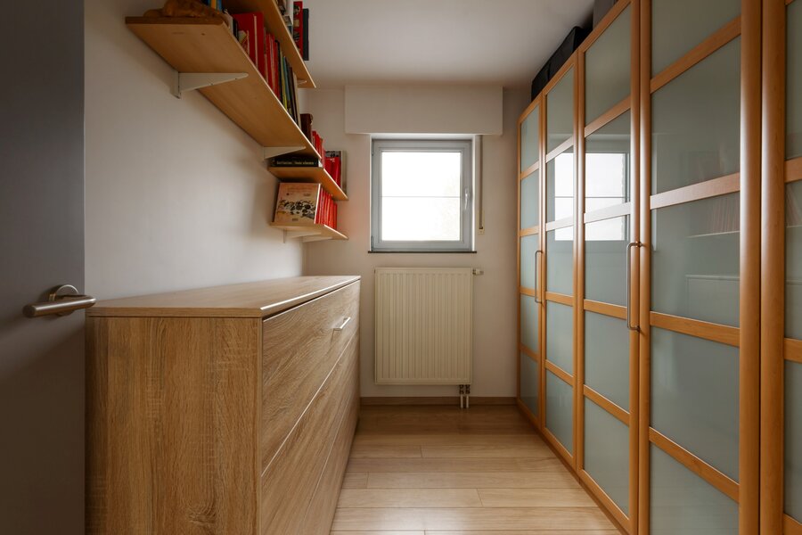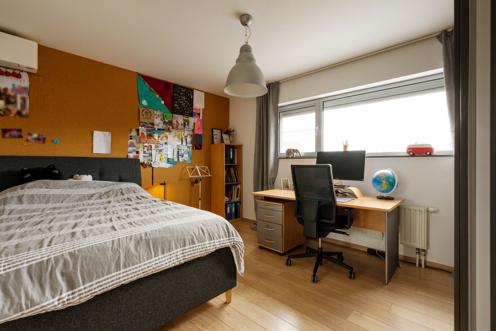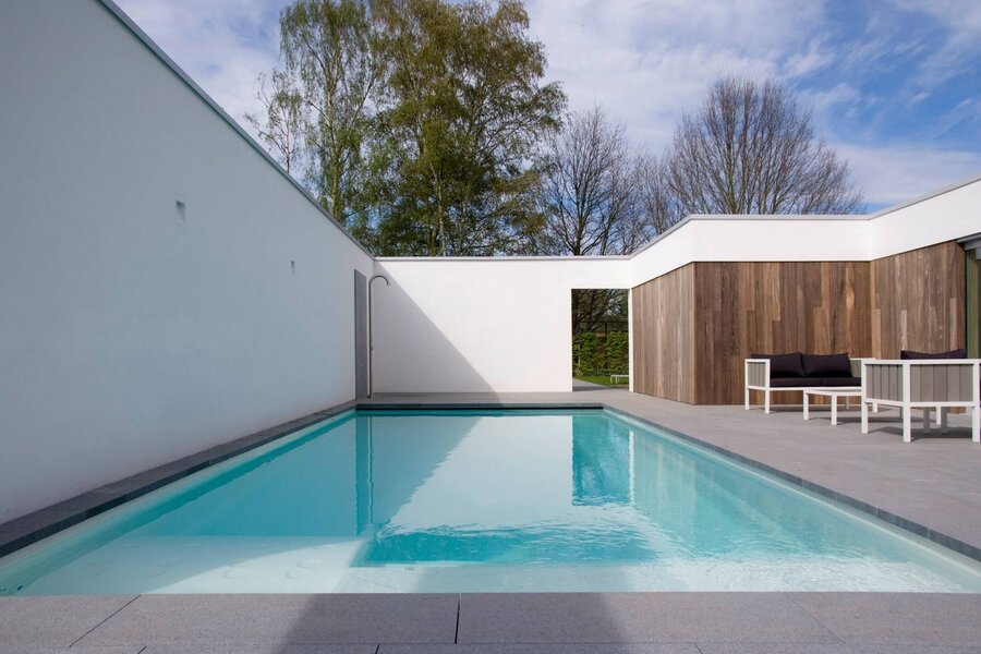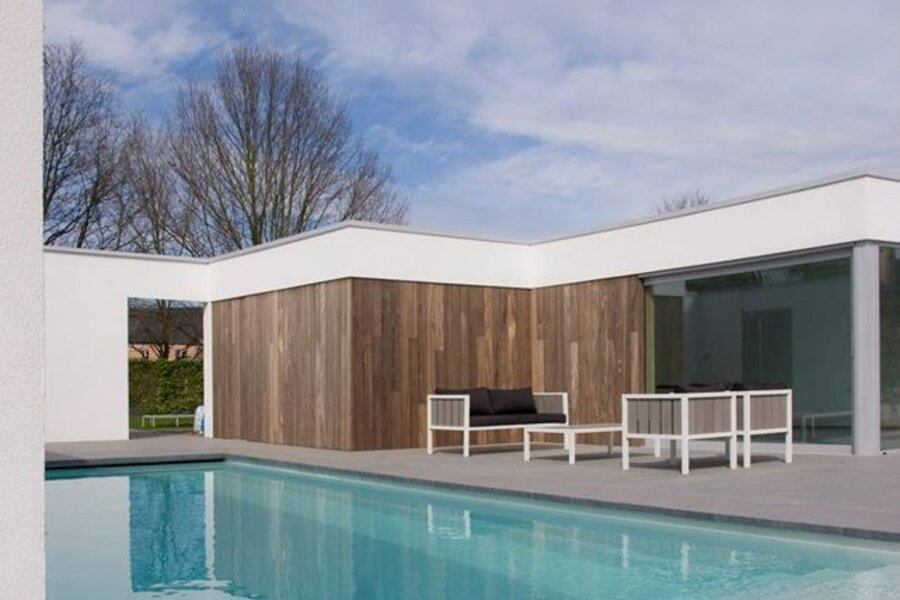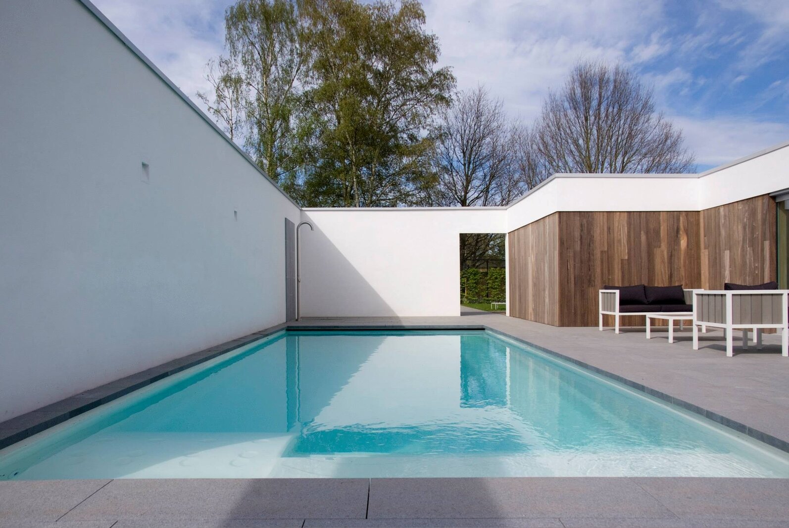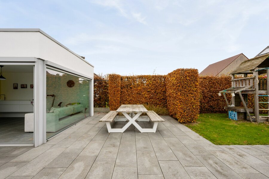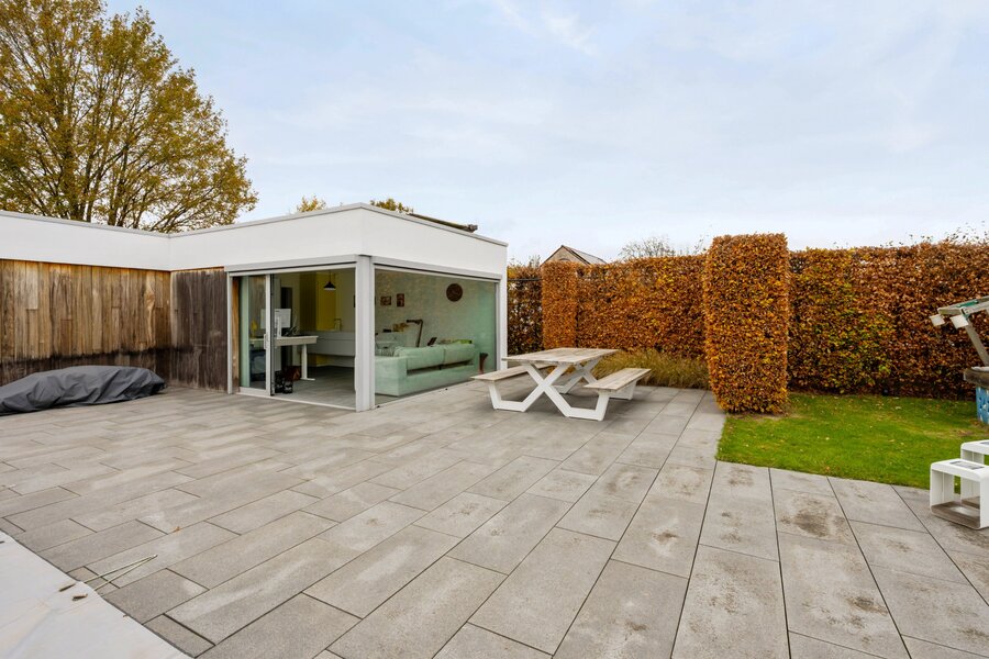 Achteraan de woning bevindt zich een ruim en zonnig terras met lamellen, waar men in alle privacy kan genieten. Het stijlvolle poolhouse is volledig voorzien van vloerverwarming en beschikt over een apart toilet, met bovendien de mogelijkheid om een douche te installeren. Deze ruimte wordt momenteel ingericht als bureau. Aan het zwembad is eveneens een praktische buitendouche voorzien.