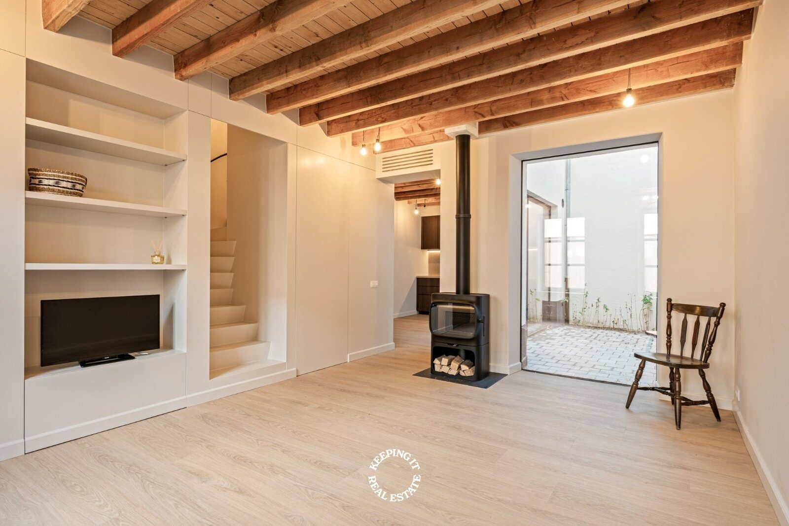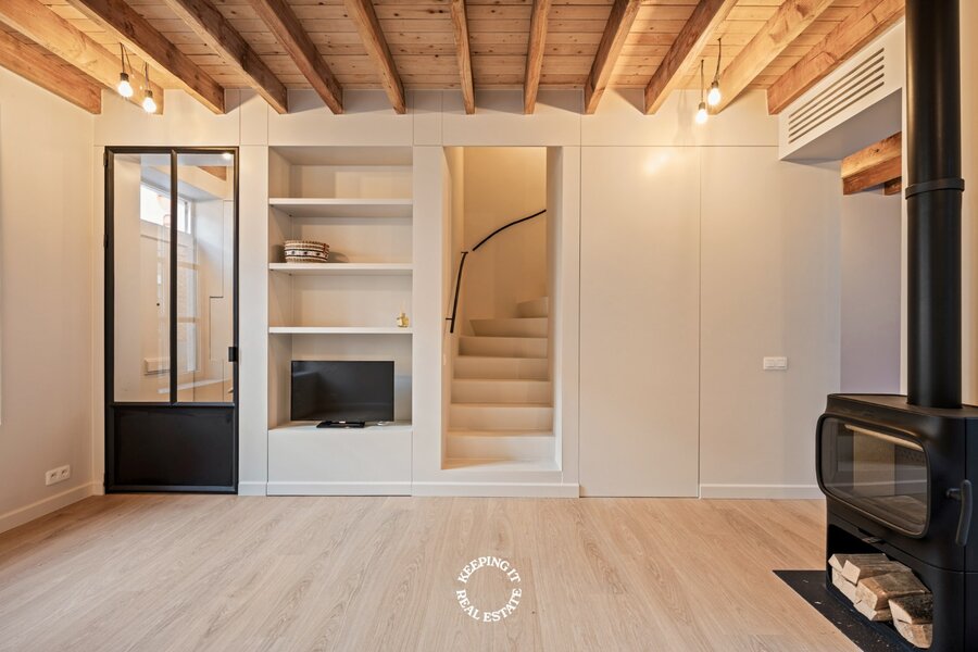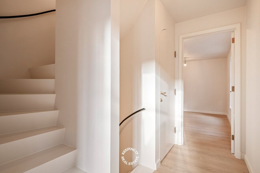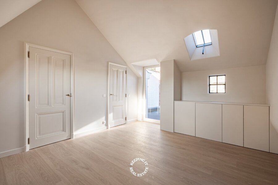 De indeling werd met zorg ontworpen: een inkomhal met ingemaakte vestiairekast leidt naar de lichtrijke woonkamer met sfeervolle kachel en ingebouwde tv-kast. Aansluitend bevindt zich een mooie leefkeuken met eetruimte en toegang tot het charmante terras in een oase van rust, midden in de stad. Op de eerste verdieping bevinden zich twee slaapkamers, een afzonderlijk toilet en een ruime badkamer met ligbad en inloopdouche. De tweede verdieping is volledig ingericht als master, met een gevoel van ruimte en sereniteit. In de slaapkamers zijn de nodige aansluitingen voorzien om bijkomende douchekamer te installeren.