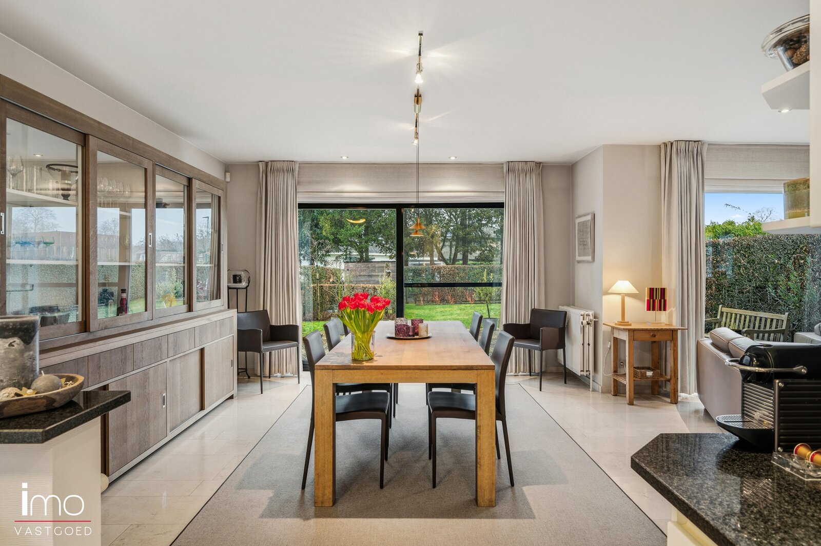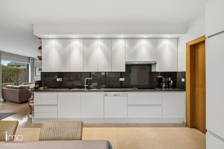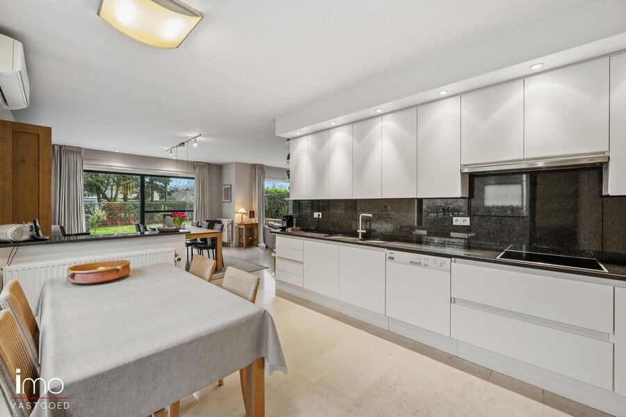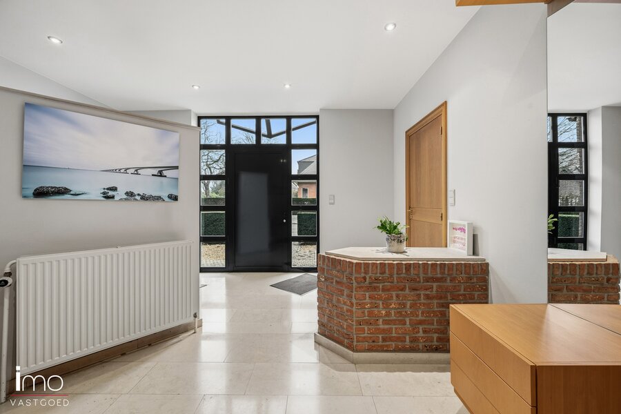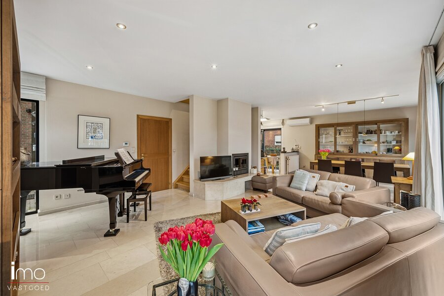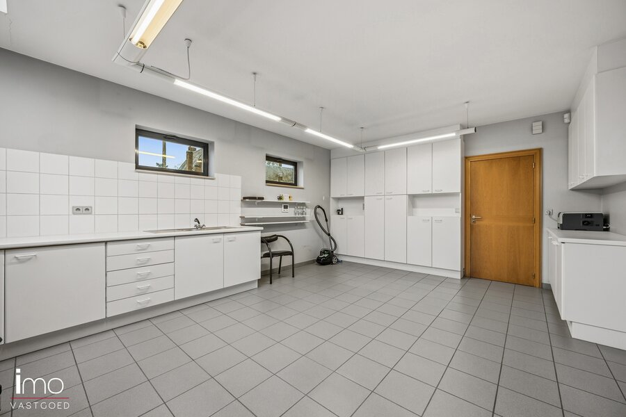 U komt binnen via een ruime inkomhal, die ook perfect kan dienen als wachtruimte voor een vrij beroep. Aansluitend bevindt zich de lichtrijke leefruimte met open keuken, beide met uitzicht op en directe toegang tot de westgericht aangelegde en uitstekend onderhouden tuin. Op het gelijkvloers vindt u verder een ruime garage met toegang tot de kelder en de wasplaats, evenals een polyvalente ruimte van 25 m² die ideaal is voor een vrij beroep, kantoor of hobbyruimte.