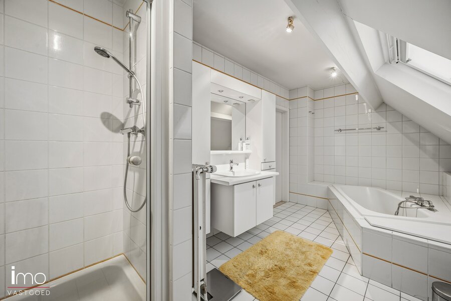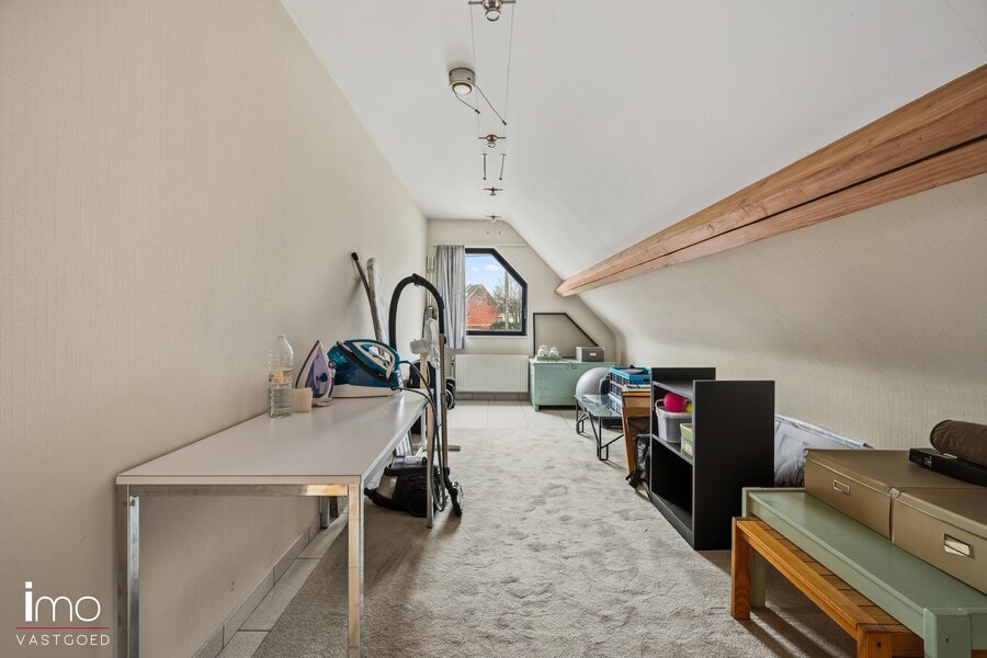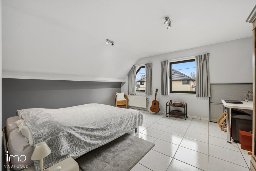 De eerste verdieping omvat vier volwaardige slaapkamers, waarvan één kamer ensuite momenteel ingericht is als dressing. Daarnaast beschikt deze verdieping over een badkamer en een bijzonder ruime overloop. Deze open ruimte leent zich perfect tot het creëren van een bureauruimte, speelhoek of extra polyvalente zone.