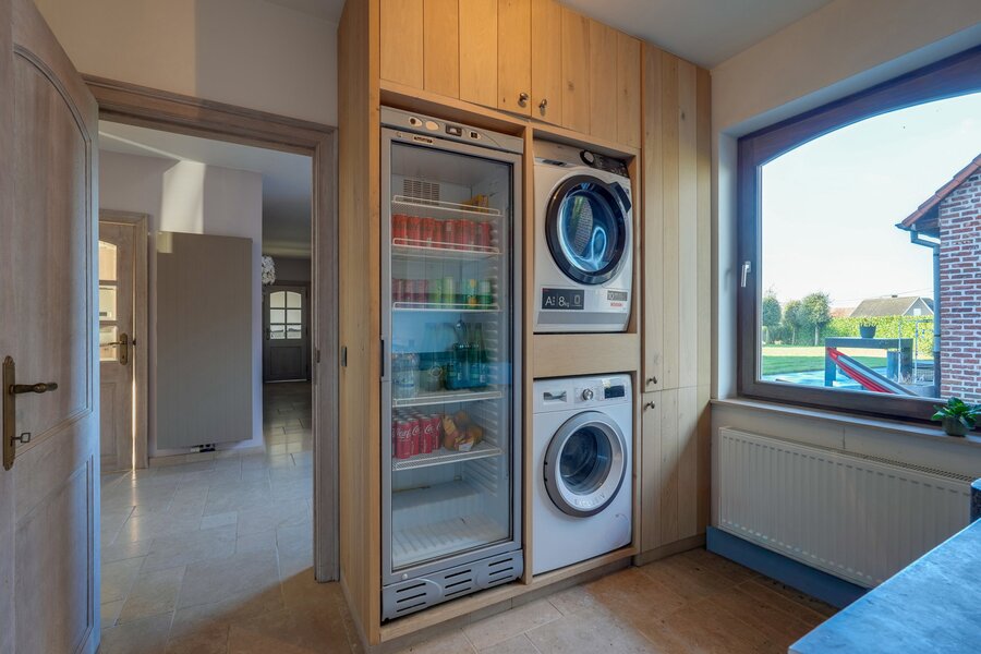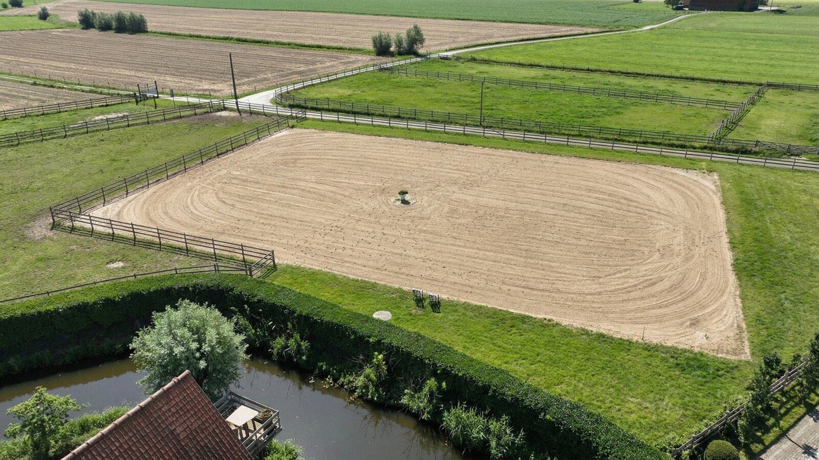 The property further features an indoor arena (approx. 35 x 20 m) and a professionally constructed, drained outdoor arena (approx. 40 x 60 m). Additional facilities include a wash area with solarium, tack room, rug room, dedicated laundry for horse equipment and blankets, and a separate feed room with silo. At the rear of the estate, space is foreseen for the installation of a horse walker.