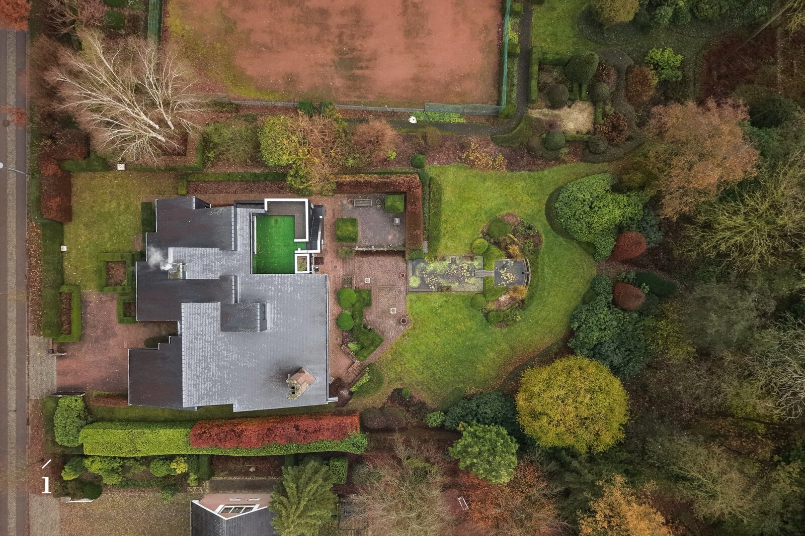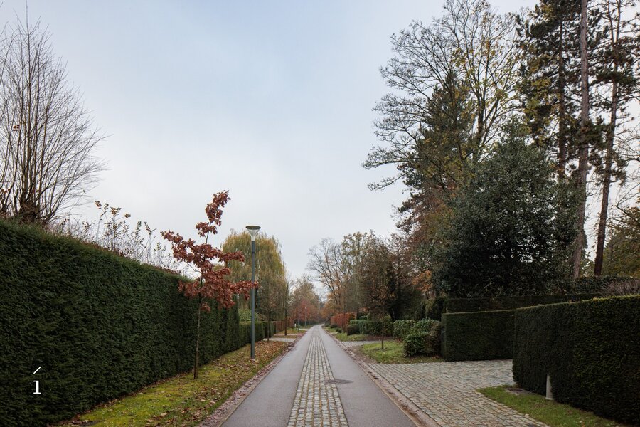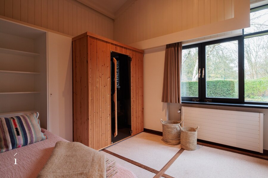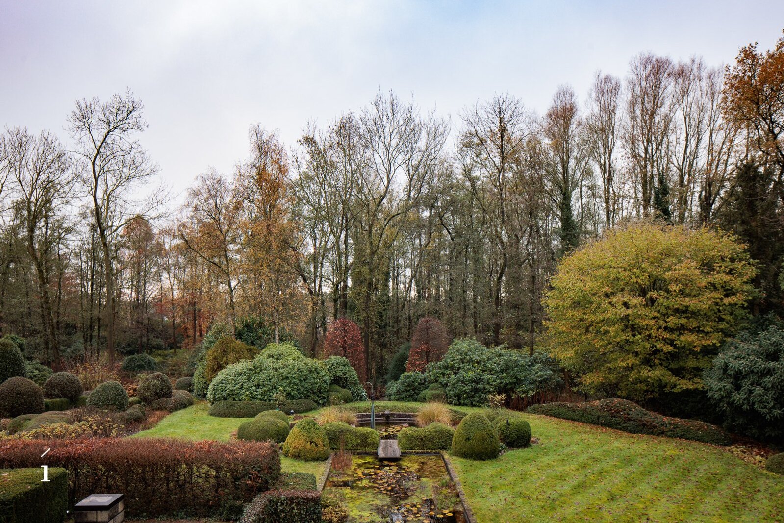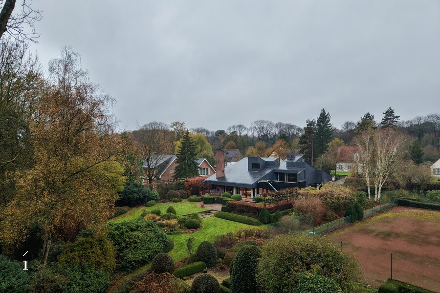De tuin van 2.399 m², met een zuidelijke oriëntatie, is prachtig aangelegd en versterkt de architectuur van de woning. Het bos, dat deel uitmaakt van de tuin, bevat een serene sfeer waar u kan genieten van de rust en stilte.