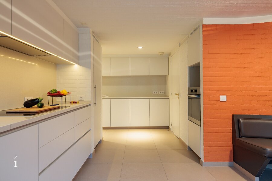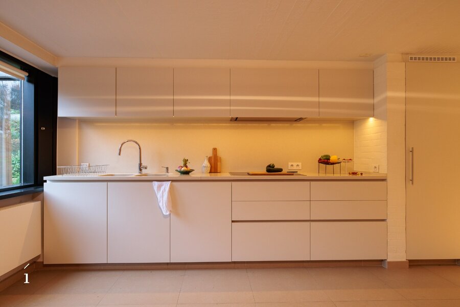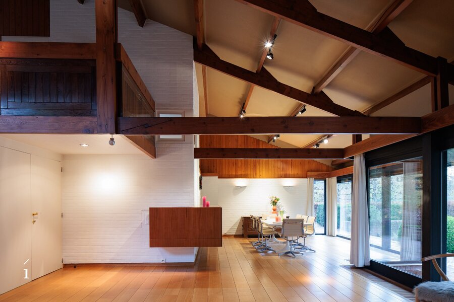 De woning biedt ruimte & flexibiliteit. Ze omvat een ruime woonkamer met haard, een bureel en een eetplaats, welke allen naadloos in elkaar overvloeien. Aansluitend tref je de leefkeuken en bijkeuken.