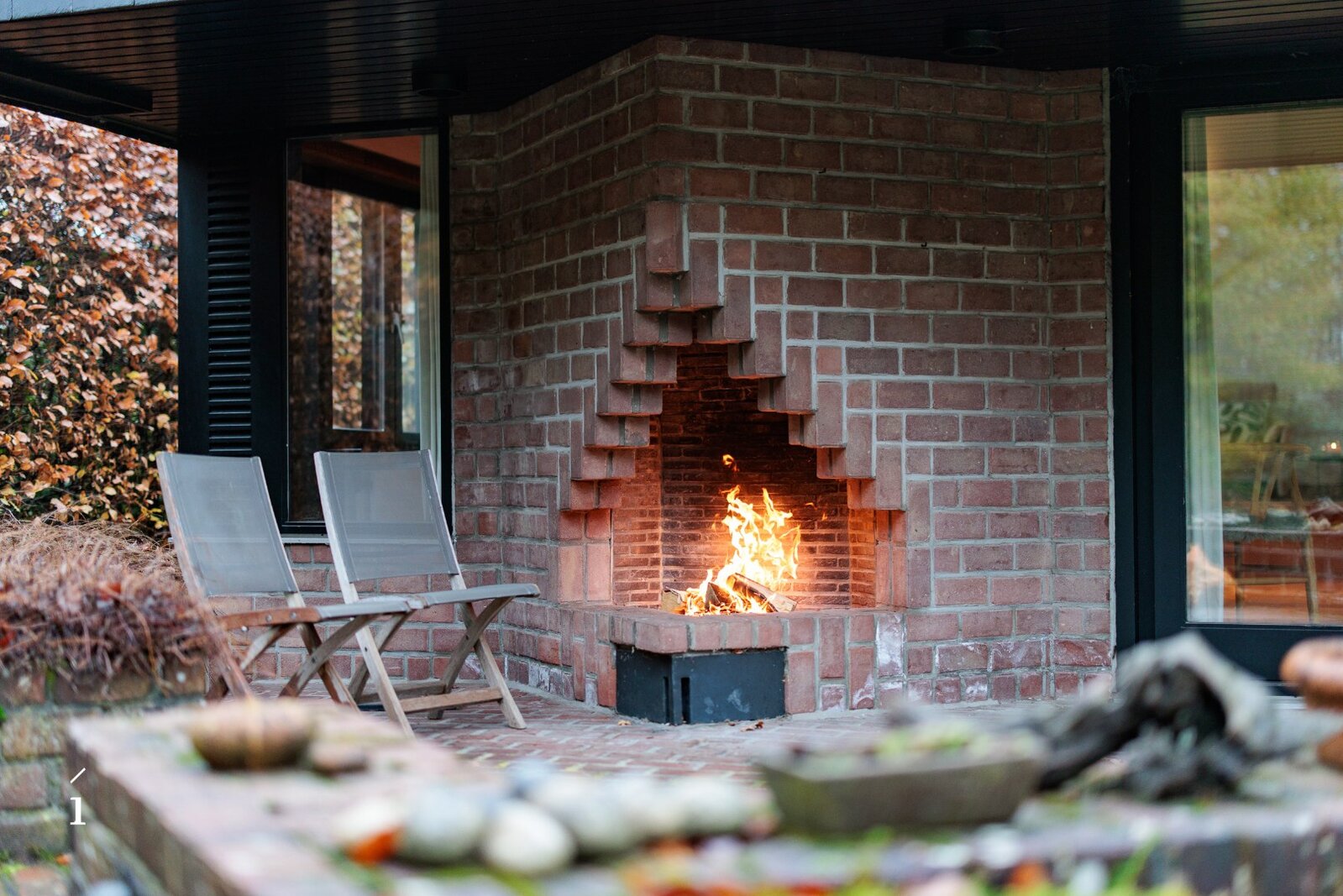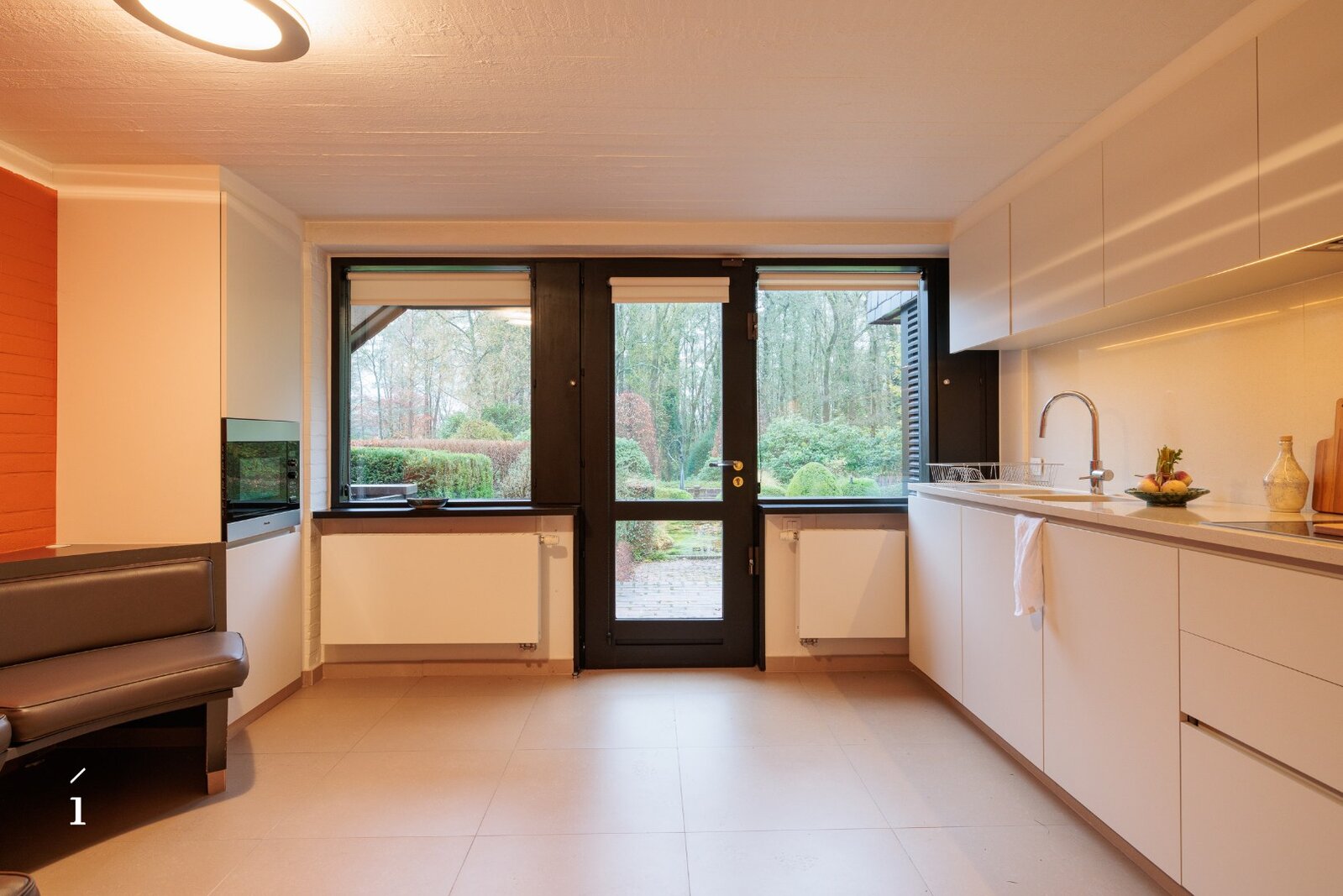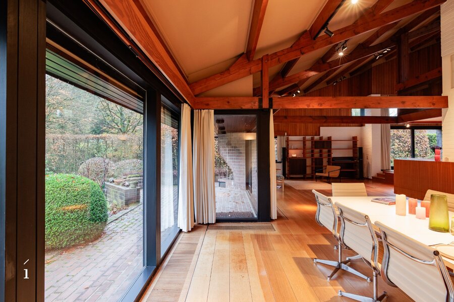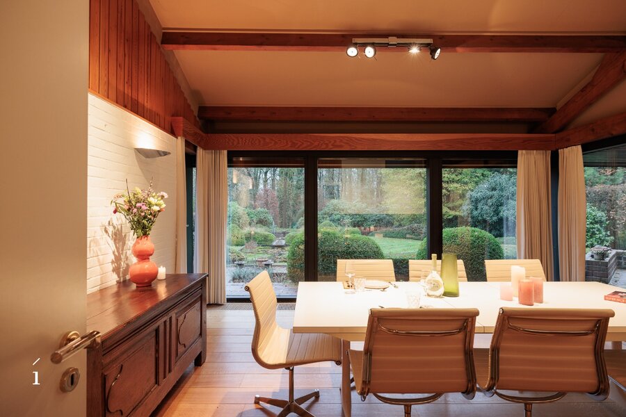 Dankzij de grote raampartijen baadt de woning in natuurlijk licht, en biedt het uitzicht op de tuin en het aangrenzende terras, zodat je volop kunt genieten van de buitenruimte.