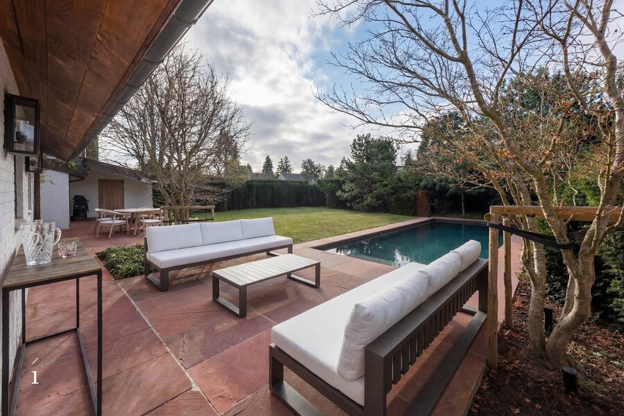 De volledig aangelegde tuin vormt een volwaardig verlengstuk van de woning en biedt volledige privacy. Volwassen groen, sfeerverlichting, automatische beregening en verschillende terrassen zorgen voor een zuiderse leefkwaliteit doorheen het jaar. Het verwarmd zwembad van 3,5 m op 9 m, uitgevoerd volgens het principe van een biopool en uitgerust met automatische regeling, warmtepomp en rolluik, versterkt het vakantiegevoel. De toegang tot het perceel gebeurt via een automatische Pouleyn-poort en er is ruime parkeergelegenheid met laadpaal.