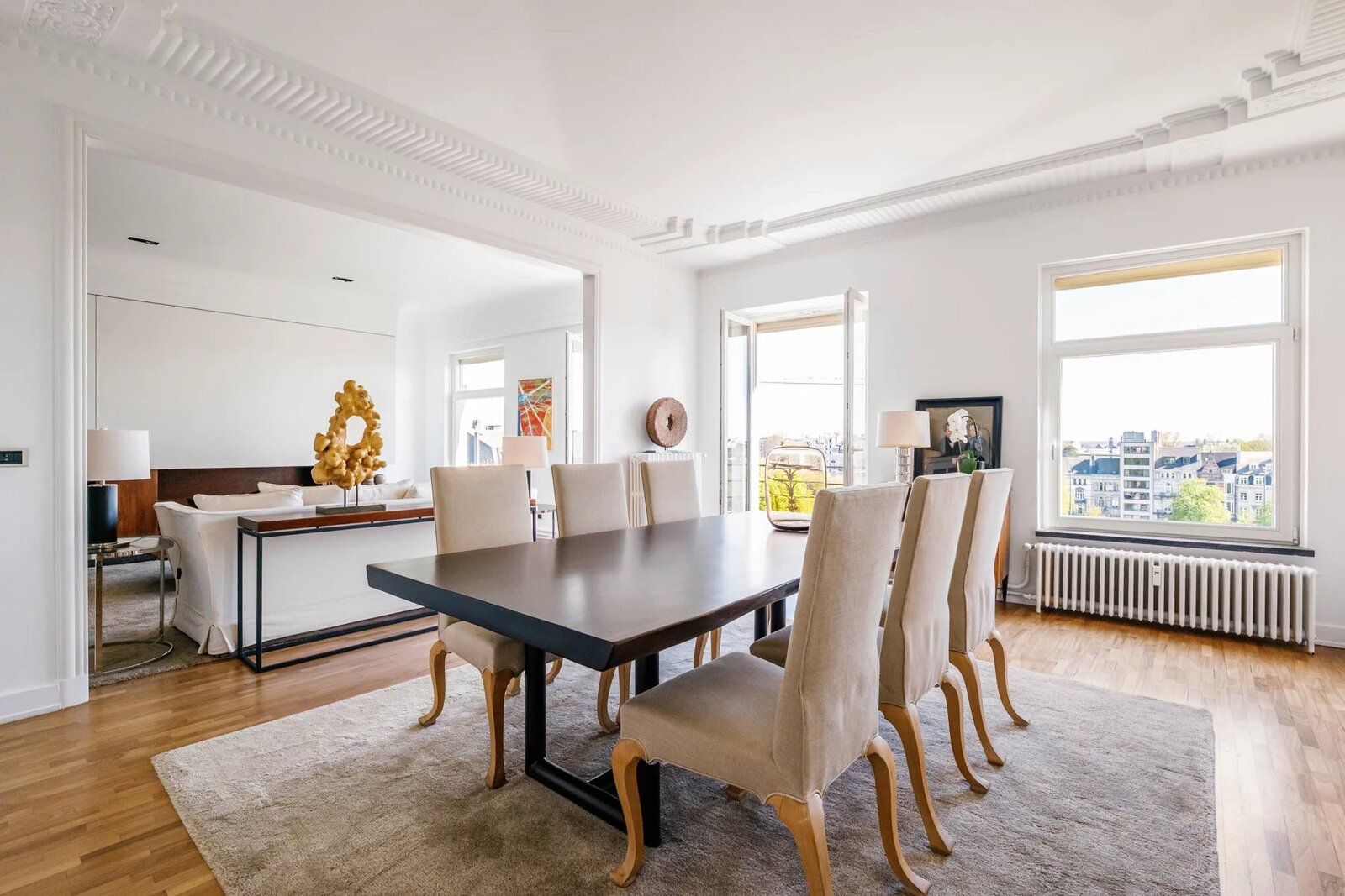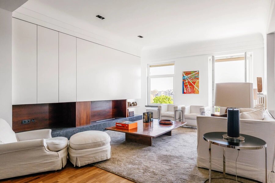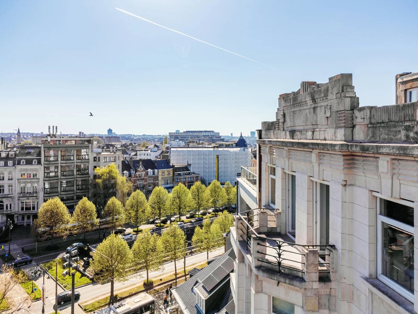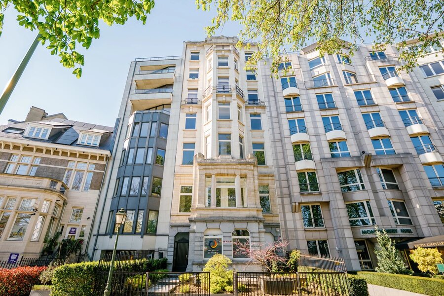 Square Montgomery – Bright penthouse of ±140 m² located on the 6th floor of an elegant building from the early 20th century. Completely renovated in 2000 with high-quality materials. Layout: entrance hall, security door, very spacious living areas overlooking Square Montgomery and the fountain, dining room, open fire, fully equipped kitchen, large rear bedroom, separate dressing room (originally a second bedroom), bathroom. Terrace of ±70 m². The apartment includes a maid’s room on the 7th floor, a cellar, and a parking box.