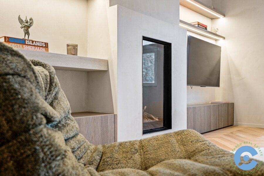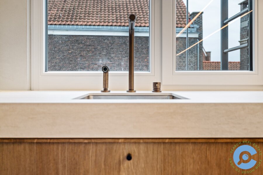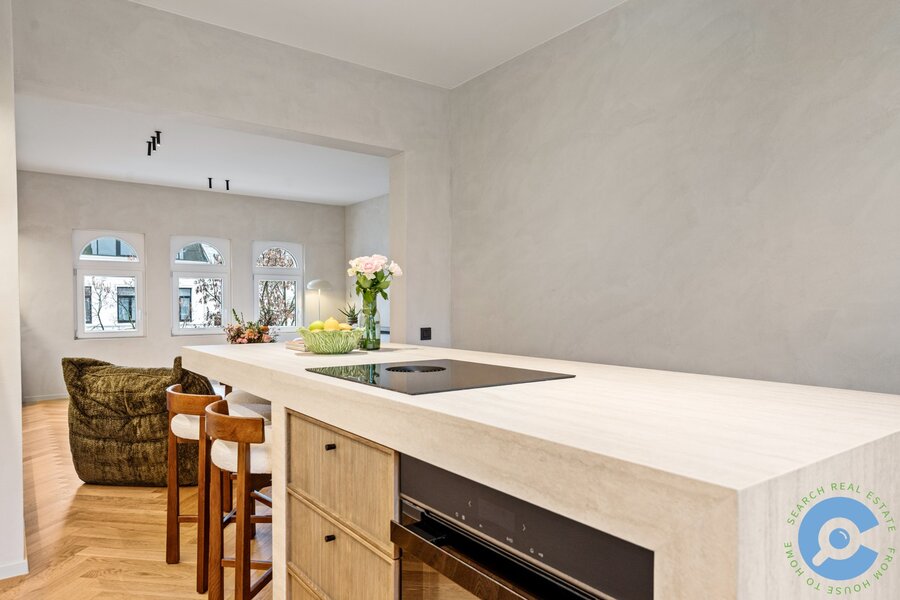 Dit luxueus gerenoveerde duplex-appartement bevindt zich op de hoogste verdieping van een kleinschalige residentie. Via de inkomhal met glazen deur betreed je de lichtrijke open leefruimte, waar gezelligheid en comfort centraal staan. De gashaard vormt een echte eyecatcher en sluit perfect aan bij de high-end afwerking en het gebruik van kwaliteitsvolle materialen. Aansluitend bevindt zich de volledig uitgeruste keuken, voorzien van alle hedendaags comfort.