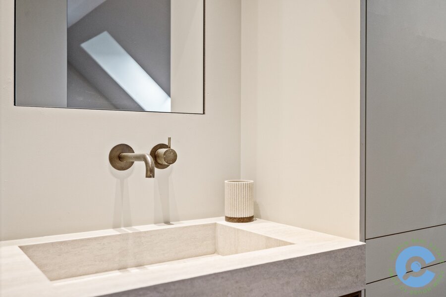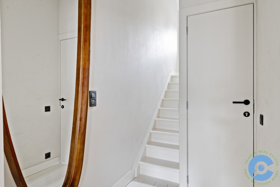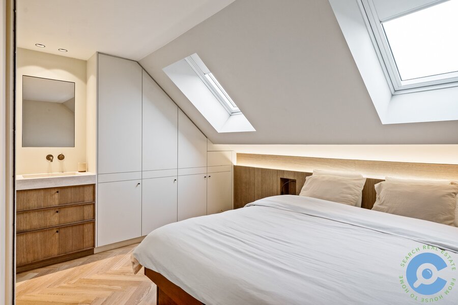 Op de bovenverdieping vind je twee slaapkamers, beide uitgerust met ingemaakte kasten en een eigen lavabo. De centraal gelegen badkamer beschikt over een stijlvolle inloopdouche en een apart toilet. Daarnaast is er een mezzanine, ideaal als extra slaapruimte, wasplaats of stockage.