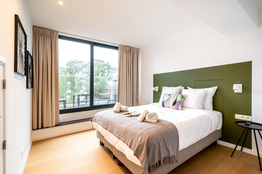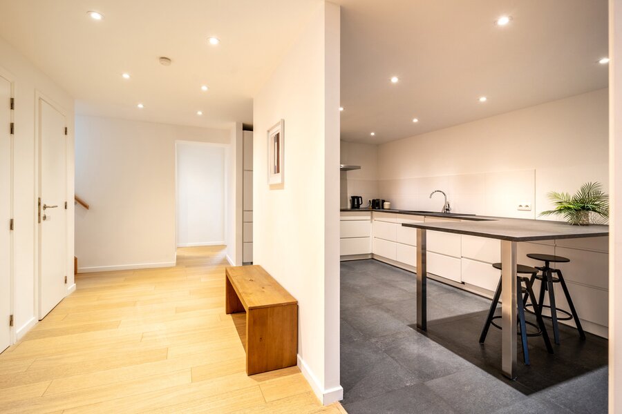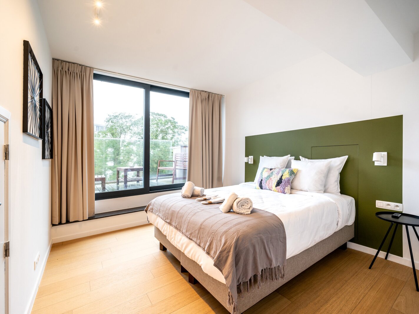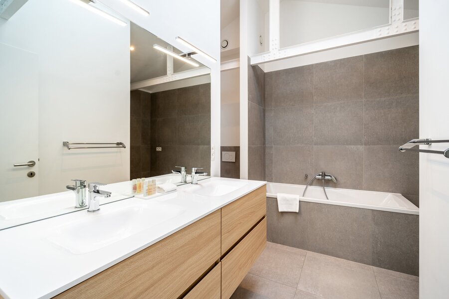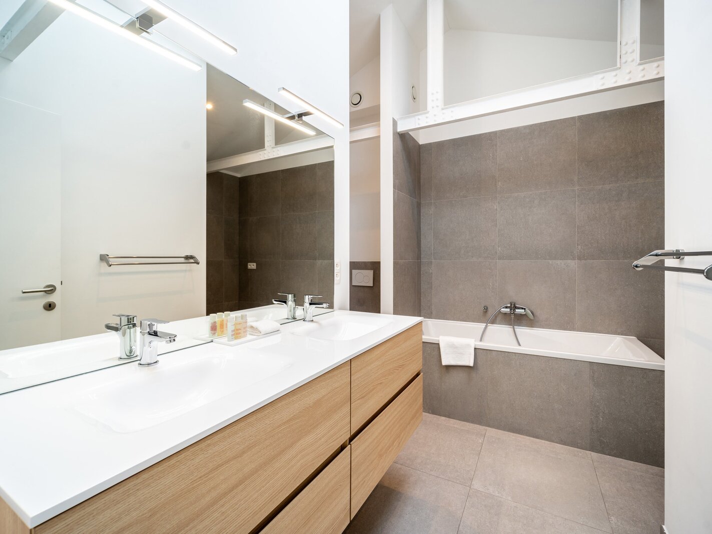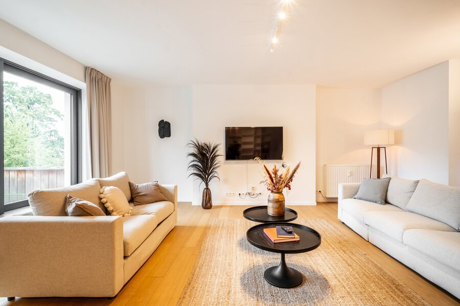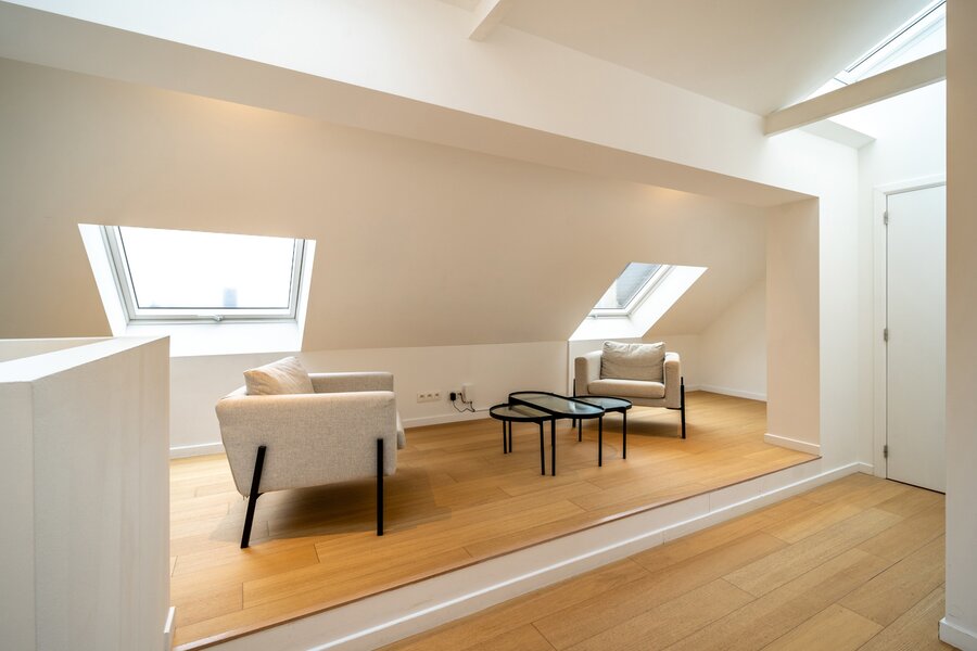 The apartment located on the fourth floor with direct access by elevator, opens onto the living/dining room area of ± 46 m² and gives access to a first terrace of ± 14 m² ideally oriented. A fully equipped semi-open kitchen completes the living areas. On the night side, two bedrooms of ± 16 and 10 m² with private bathroom and on the upper floor, a third bedroom ± 15 m² with office space, separate dressing room, full bathroom and terrace. A separate laundry room completes the set.