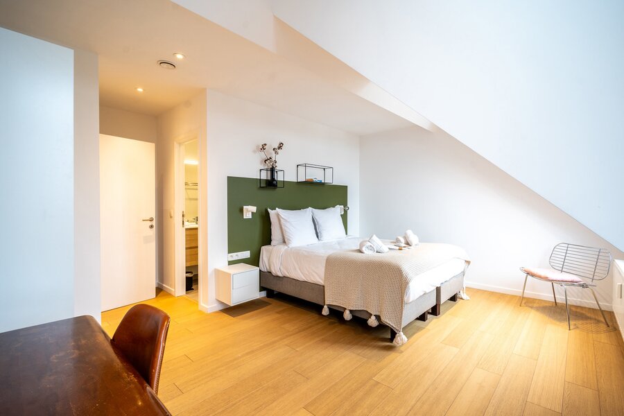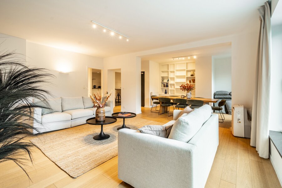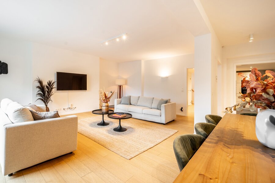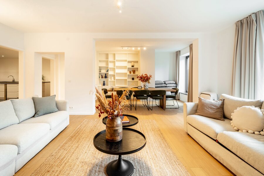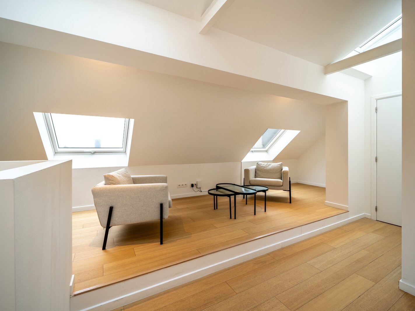 Ideally located between Place Stéphanie and Place du Châtelain, close to shops and public transport, in a fully renovated 1907 Renaissance-inspired Beaux-Arts house, furnished duplex apartment with a gross surface area according to PEB of ± 207 m² offering three bedrooms and two terraces.
