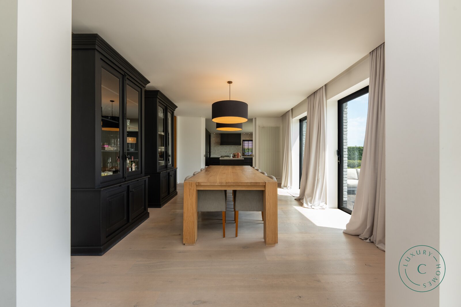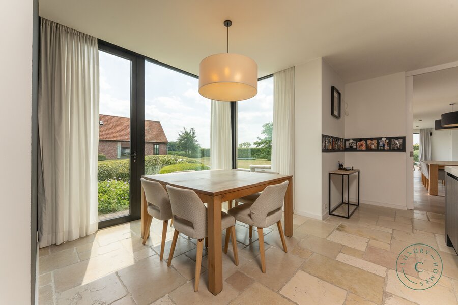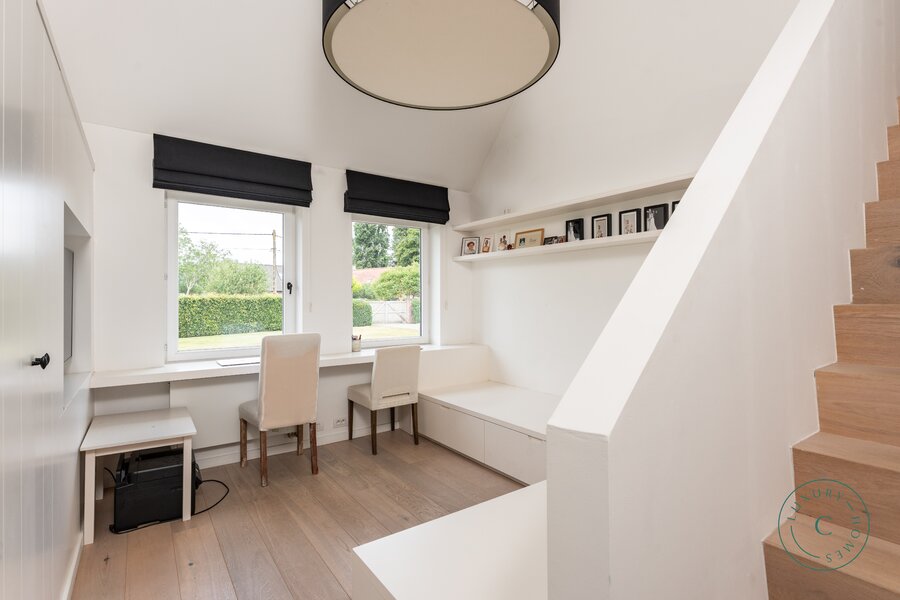 Via een statige oprijlaan met meerdere parkeerplaatsen bereik je de woning. De inkomhal geeft toegang tot de royale leefruimte, waar de leefkeuken met bijkeuken, eetplaats en gezellige zithoek één harmonieus geheel vormen. Naast de leefruimte bevindt zich verder een aangename bureauruimte die perfect kan dienst doen als extra leefruimte voor kinderen. Grote raampartijen zorgen voor veel natuurlijk licht en een rustgevend zicht op de prachtig aangelegde tuin, het zwembad en de stijlvolle bijgebouwen.