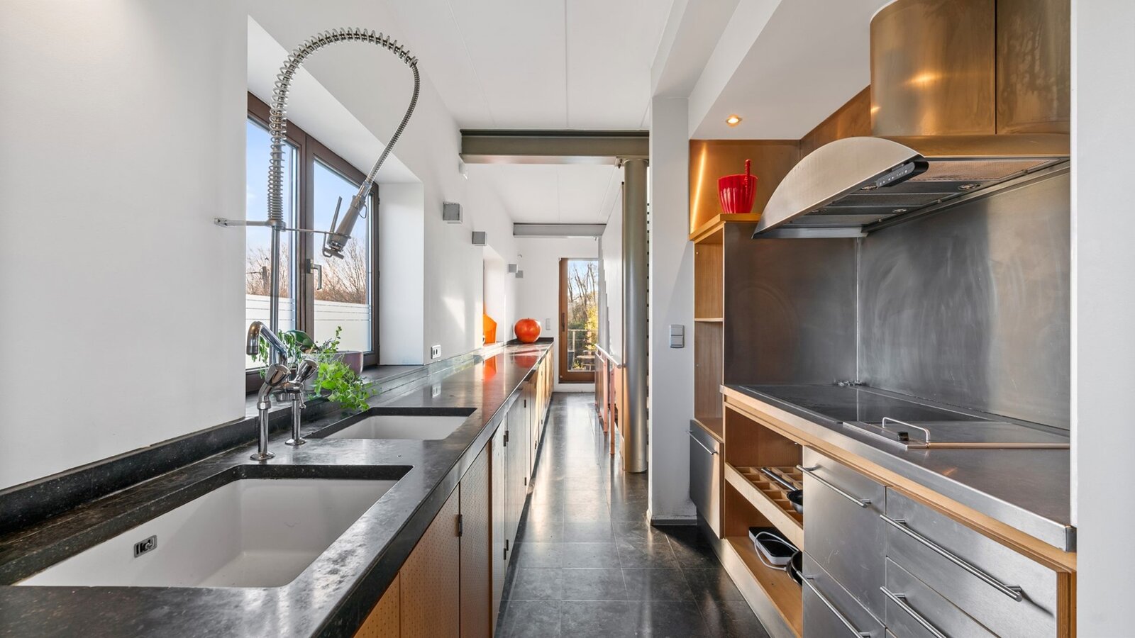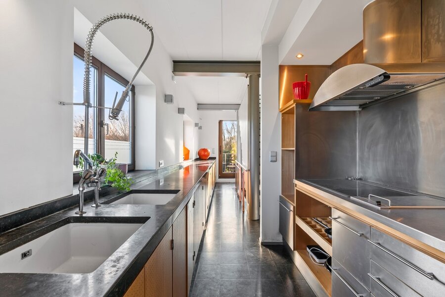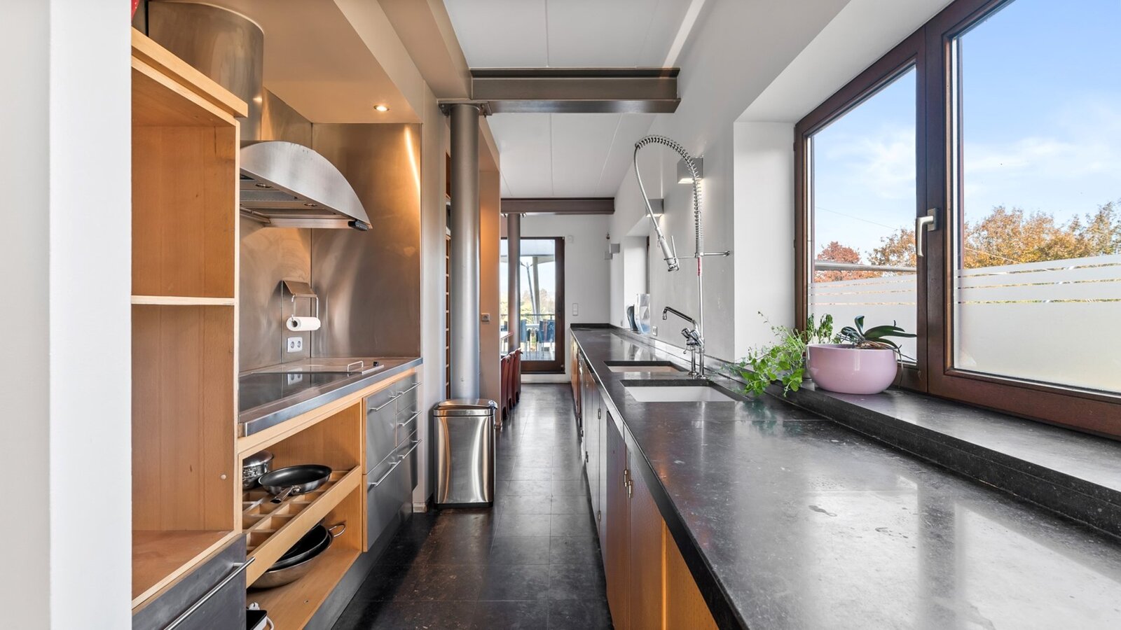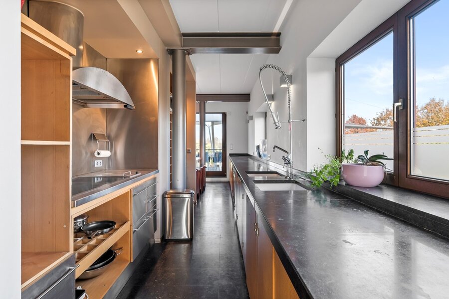 Het 1e verdiep omvat de gezellige ruime leefruimte met parket, hout inbouw cassette en toegang tot 2 zwevende terrassen en zicht op de prachtige omgeving. Langsheen vrijwel de volledige wand aan de andere zijde, bevindt zich de geïnstalleerde keuken met een enorm lang werkblad in natuursteen, zeer veel kastruimte, vaatwasser, kookhoek met inductiekookplaat, dubbele Amerikaanse koelkast en een vaste tafel, …. Het achterste terras is zeer ruim, overdekt met een architecturaal zeil en fungeert als uitbreiding van de leefruimte.