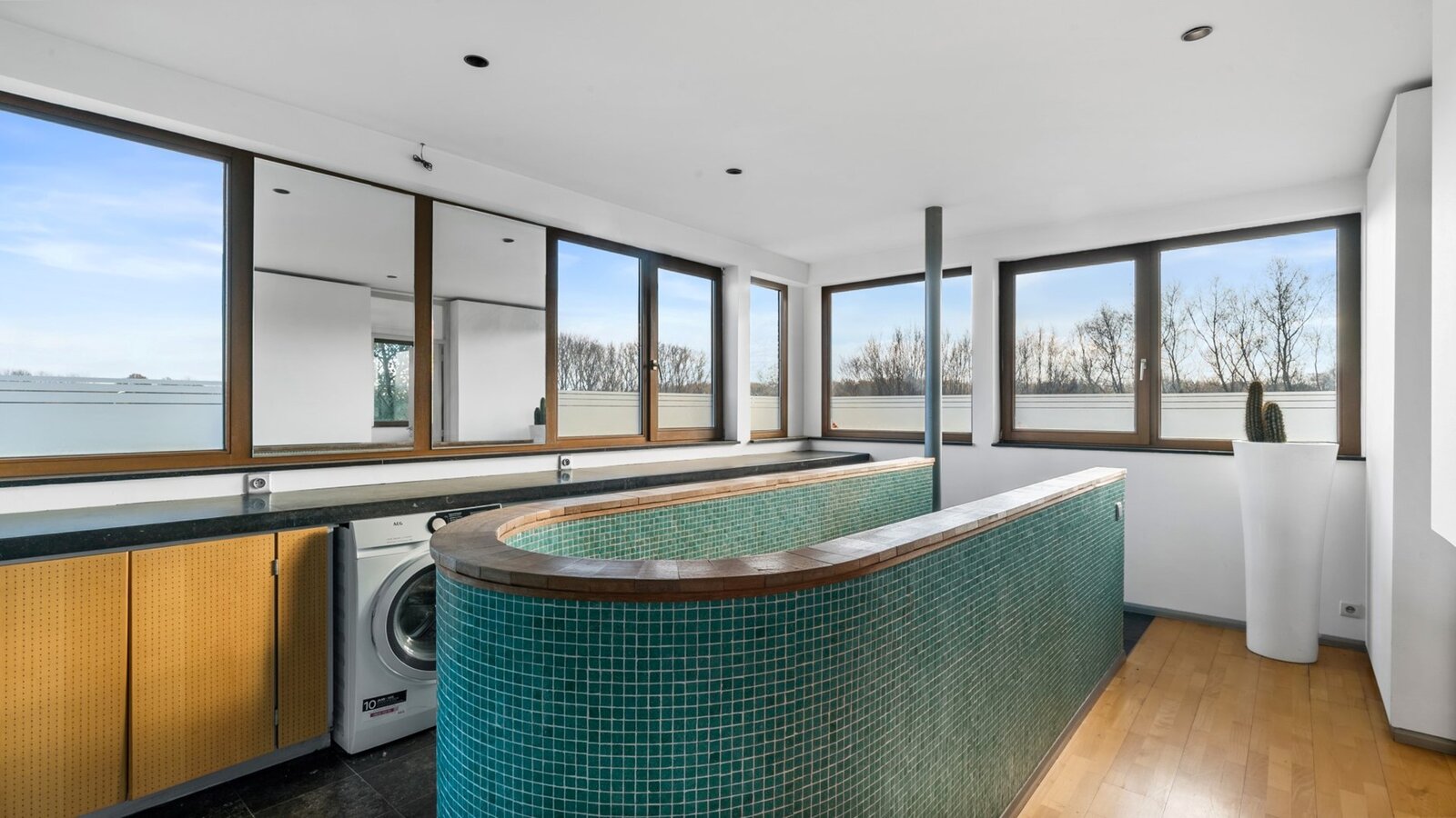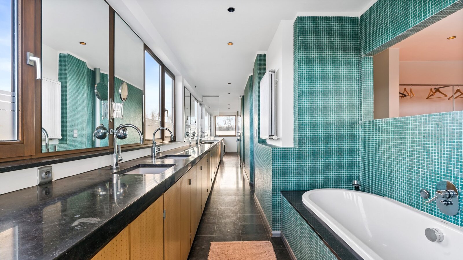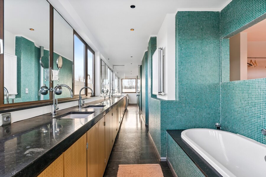 Op het 2e verdiep vinden we 4 slaapkamers, waarvan de master-bedroom voorzien is van een dressing. De badkamer/wasruimte is naar analogie met de keuken opgevat als een lang werkblad met zeer veel kastruimte en 4 wastafels. De badkamer omvat een bad, inloopdouche en de wasplaats met ruimte voor was- en droogmachine is van de badkamer gescheiden door een glazen deur.