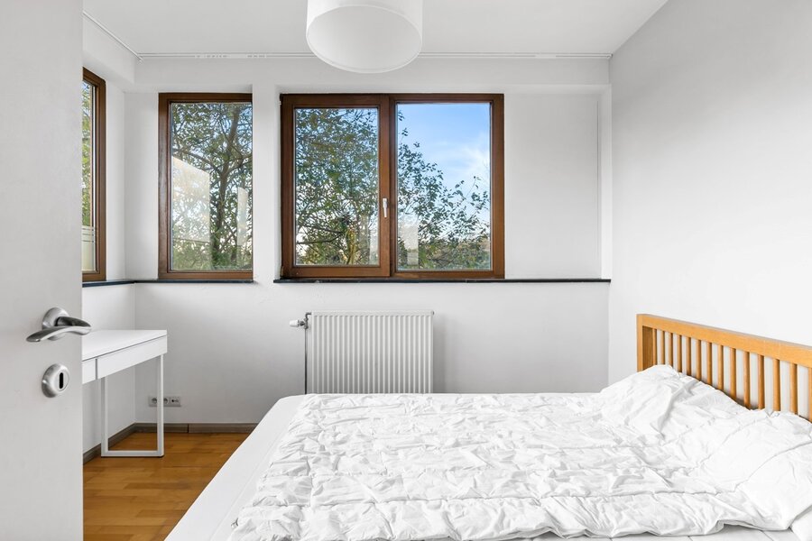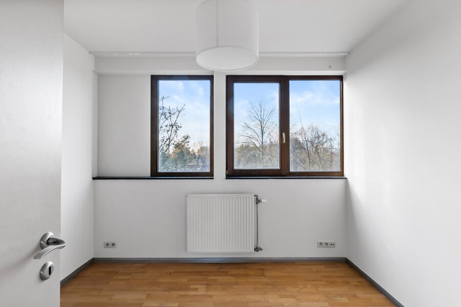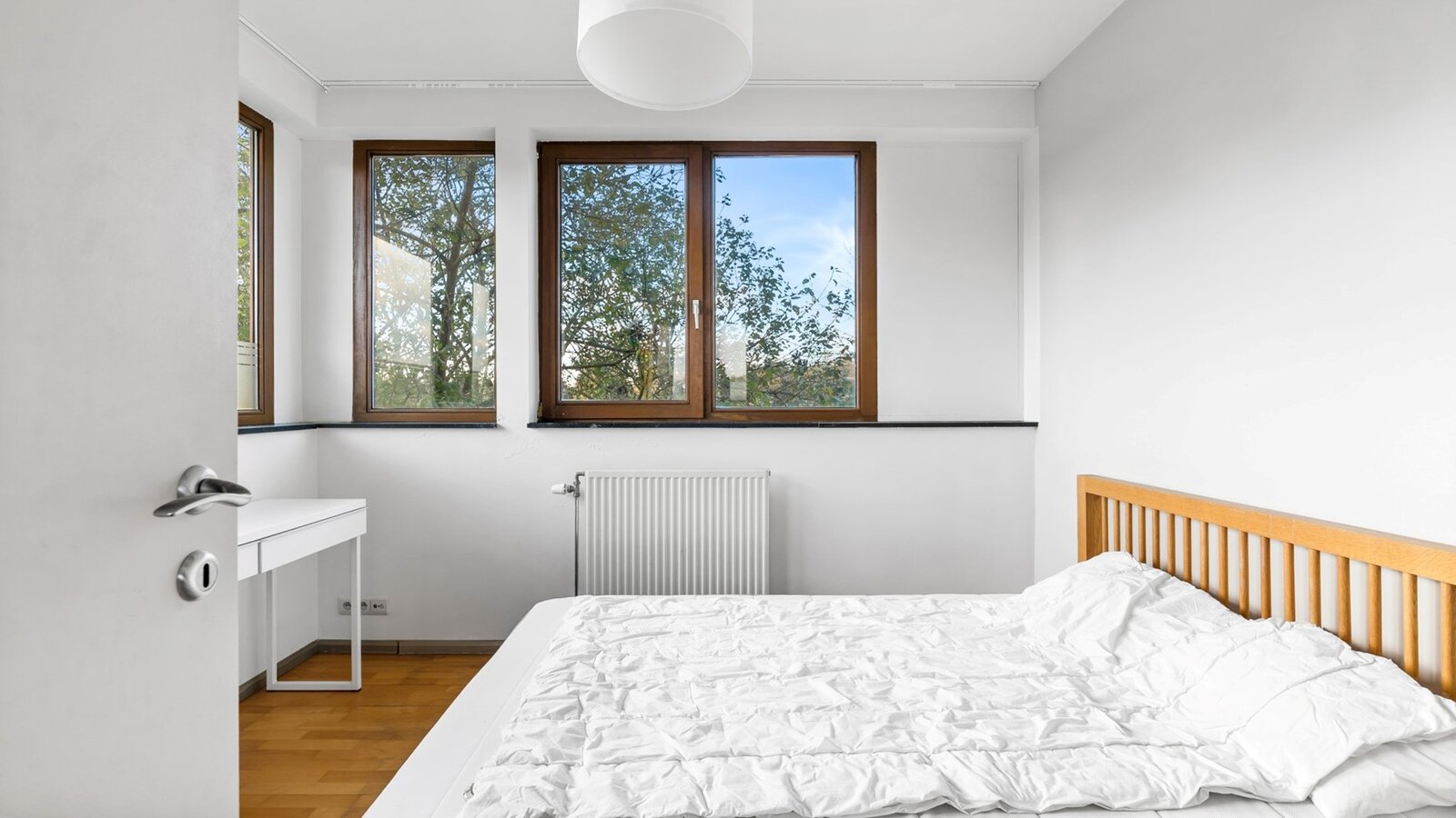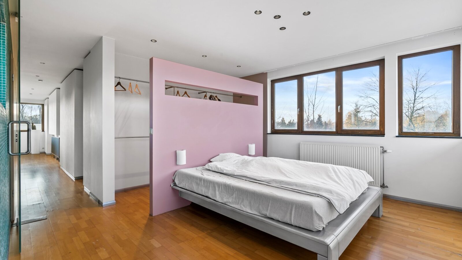 Op het 2e verdiep vinden we 4 slaapkamers, waarvan de master-bedroom voorzien is van een dressing. De badkamer/wasruimte is naar analogie met de keuken opgevat als een lang werkblad met zeer veel kastruimte en 4 wastafels. De badkamer omvat een bad, inloopdouche en de wasplaats met ruimte voor was- en droogmachine is van de badkamer gescheiden door een glazen deur.