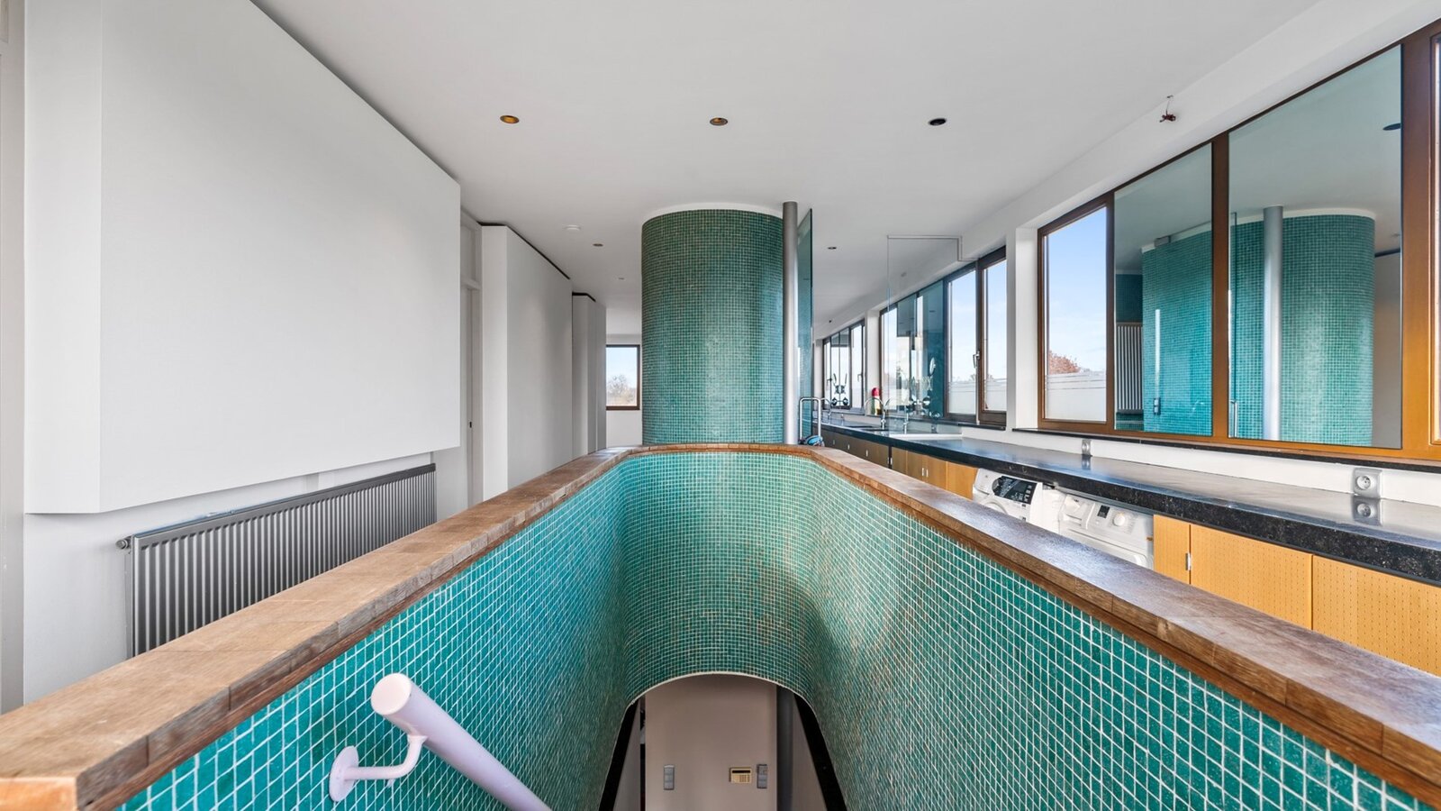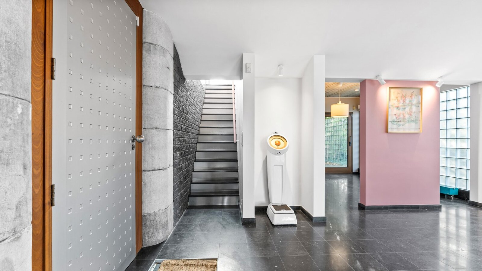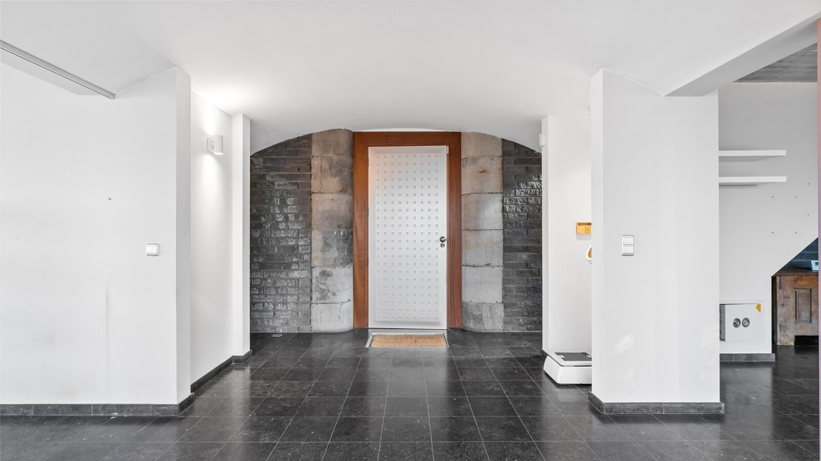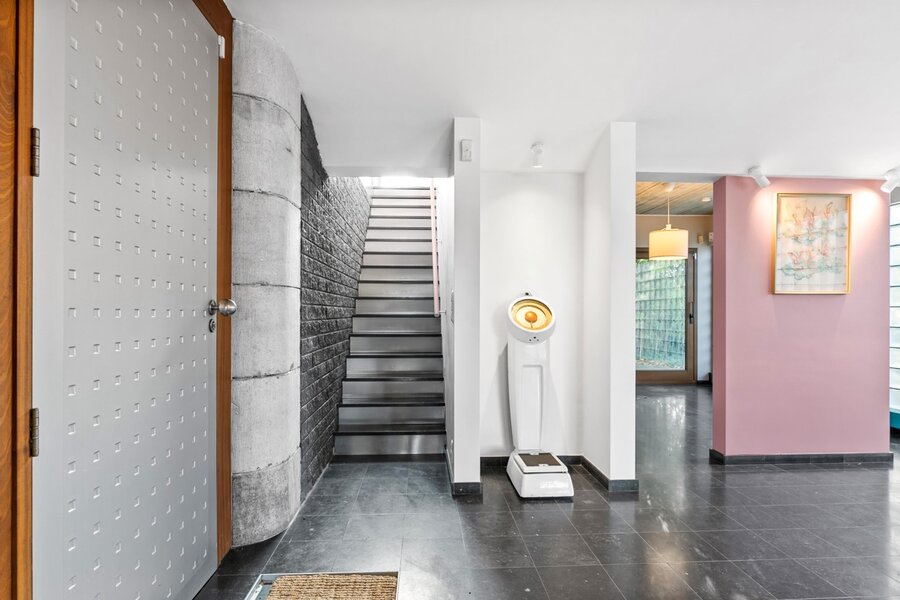 Er zijn 3 volwaardige verdiepingen. Men betreedt deze uitzonderlijke woning via een open inkomhal. Het gelijkvloers kan polyvalent ingevuld worden en leent zich ideaal tot kantoor/praktijkruimte en/of wellness met sauna, kleedkamer en douche. Via een groot schuifraam en aparte buitendeur is er toegang tot het zeer ruim terras en zwembad met mooie palmbomen en vergezichten.