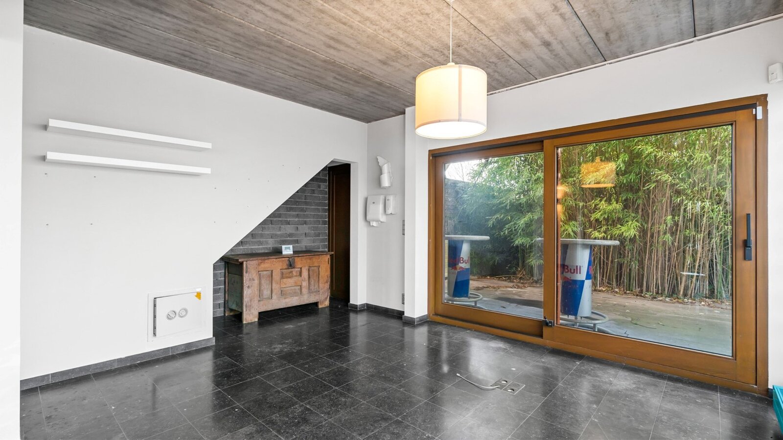 Er is een tuintrap die tot aan het terras van de leefruimte gaat. Tuinberging. Ruime parking voor meerdere wagens, ook ideaal in kader van (vrij) beroep.