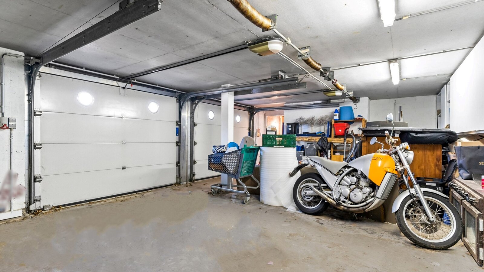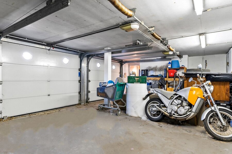 Grote inpandige dubbele garage met 2 sectionale poorten met aan alle wanden ingebouwde kasten.