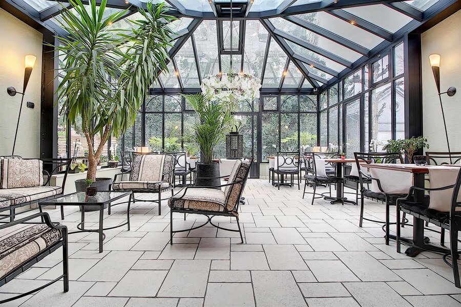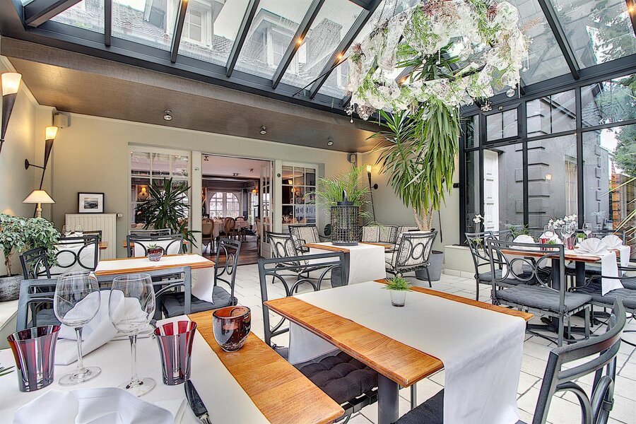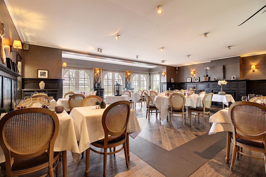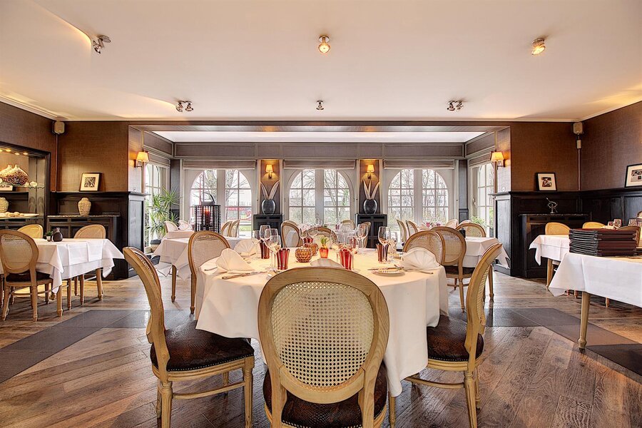 The main reception room can seat around 40 diners, and there is also an imposing veranda, known as the ‘orangery’, which can seat around 30 diners. A terrace allows you to dine outside, in a peaceful, bucolic setting. Cloakroom and customer toilets at the entrance.